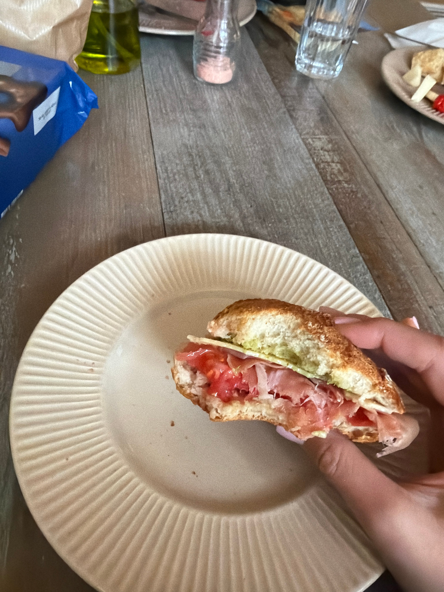 A sandwich is held above a tan, ridged plate. The sandwich appears to be made of bread, tomatoes, prosciutto, and possibly pesto. A hand holds the sandwich. Parts of a cheese and cracker plate, a glas…read more