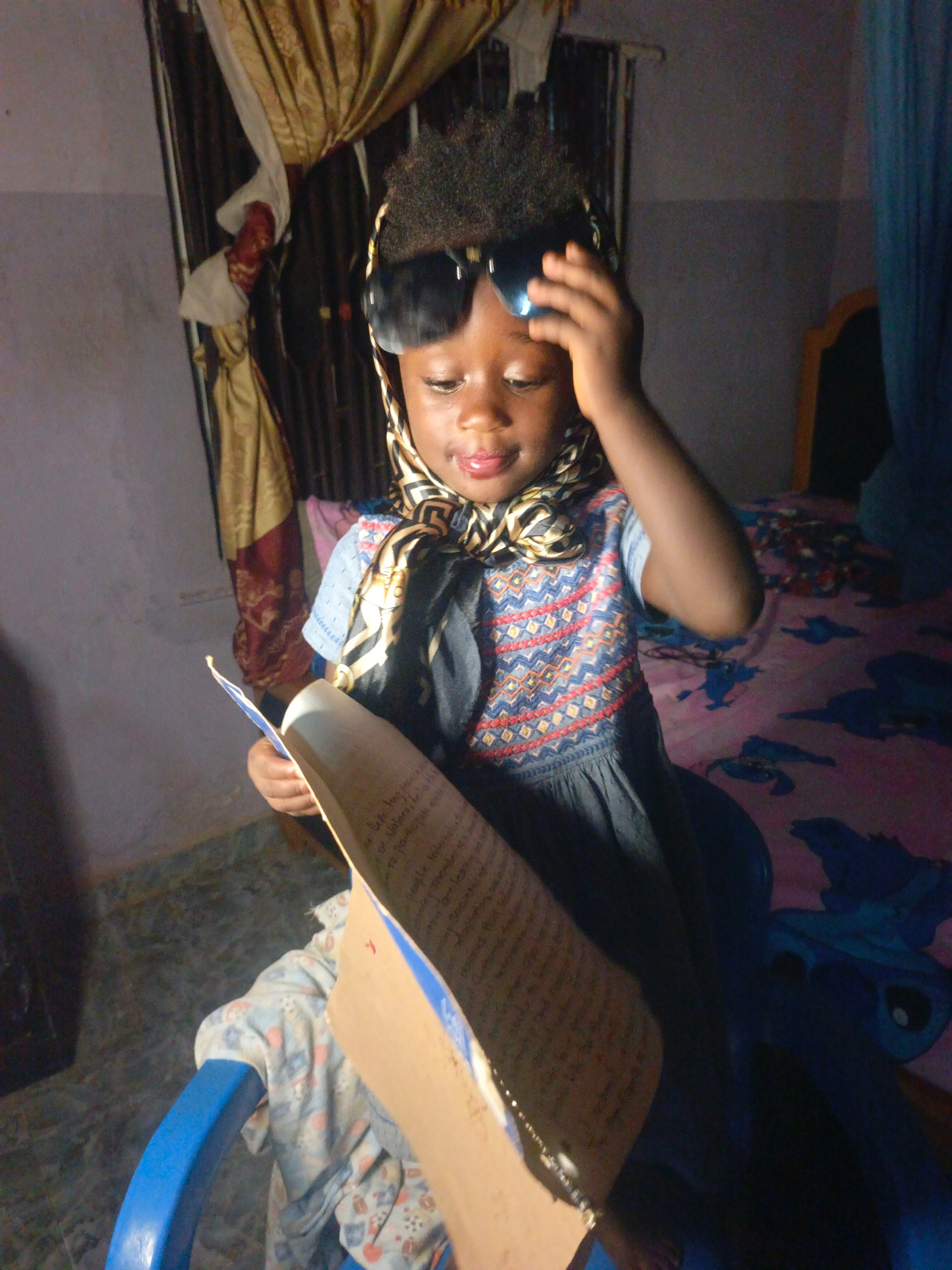 A young child is seated indoors, likely in a home, potentially in Akwanga, Nigeria given the prompt. The child is wearing sunglasses on their head and a patterned scarf around their neck. They are hol…read more
