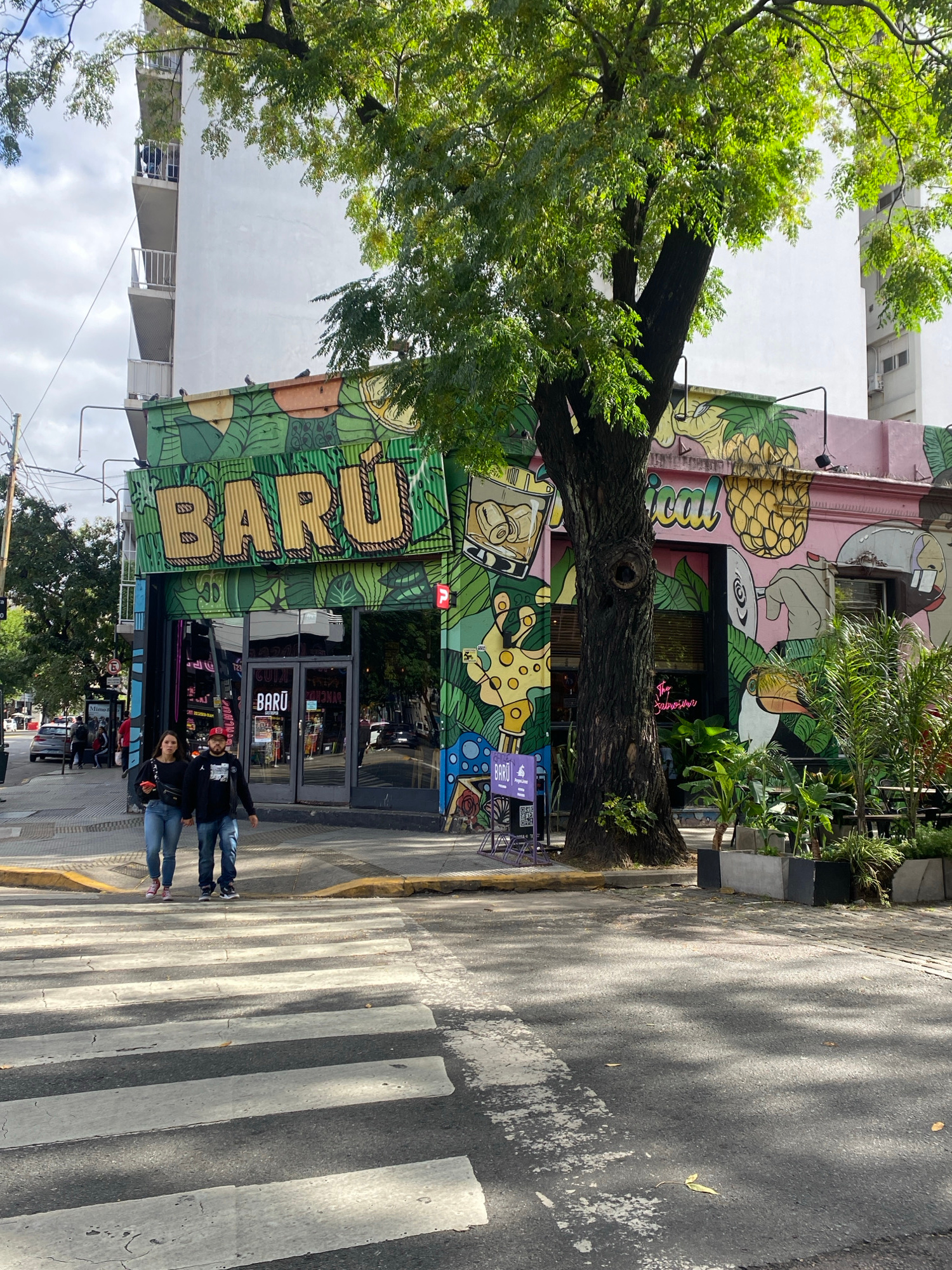 The image shows a street scene in Buenos Aires, Argentina, featuring the "Barú" bar with colorful murals. The bar's facade is adorned with painted imagery including tropical fruits, cartoon-like figur…read more