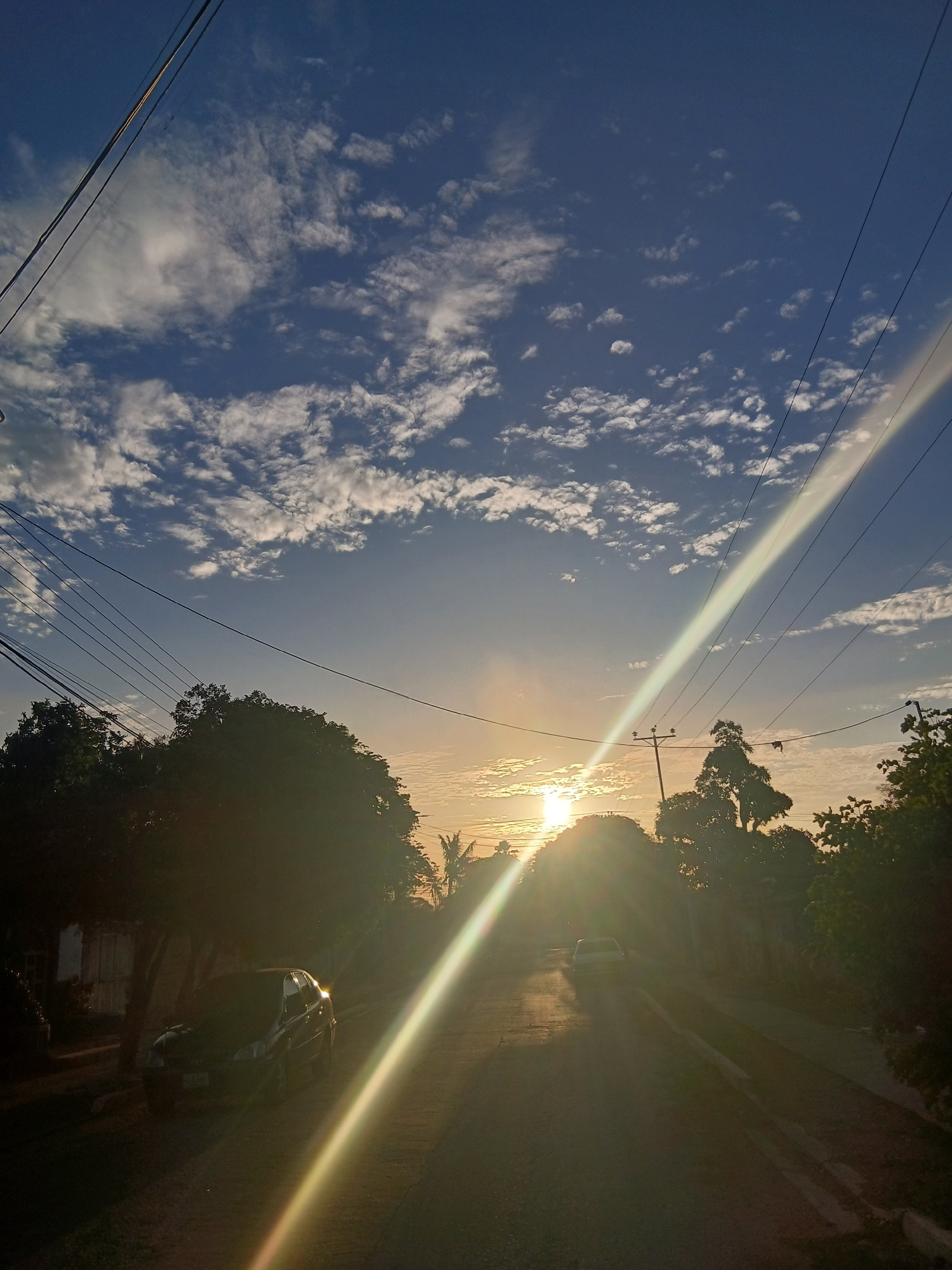 The image shows a street scene in Juan Griego, Venezuela, at sunset. The view is oriented vertically, with the sky occupying the left portion of the frame. Altocumulus clouds are scattered across a bl…read more