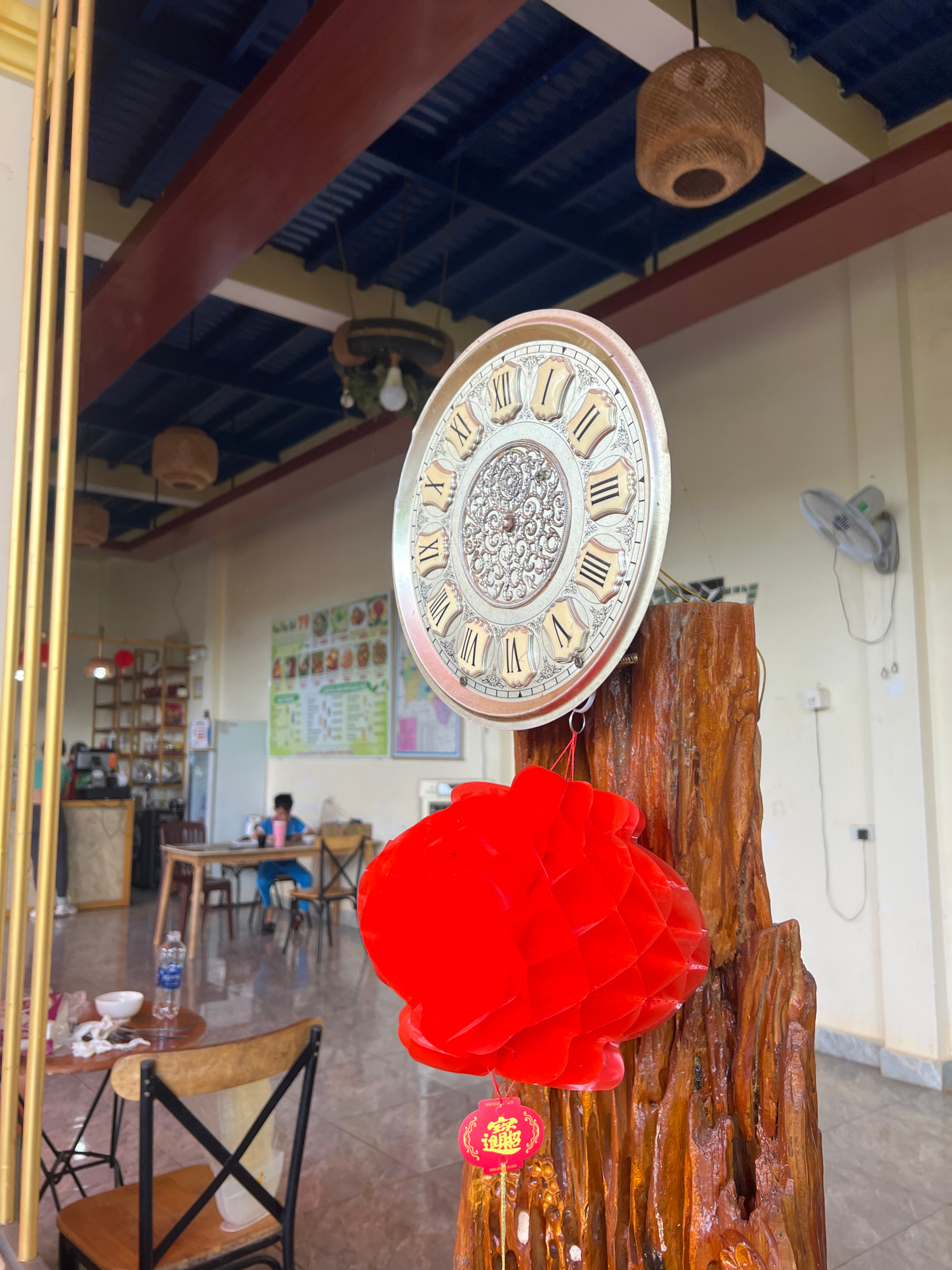 The image captures an interior scene in Ia Hru, Vietnam. A decorative clock face with Roman numerals and an intricate center design is suspended from the ceiling, along with a bright red, geometric la…read more