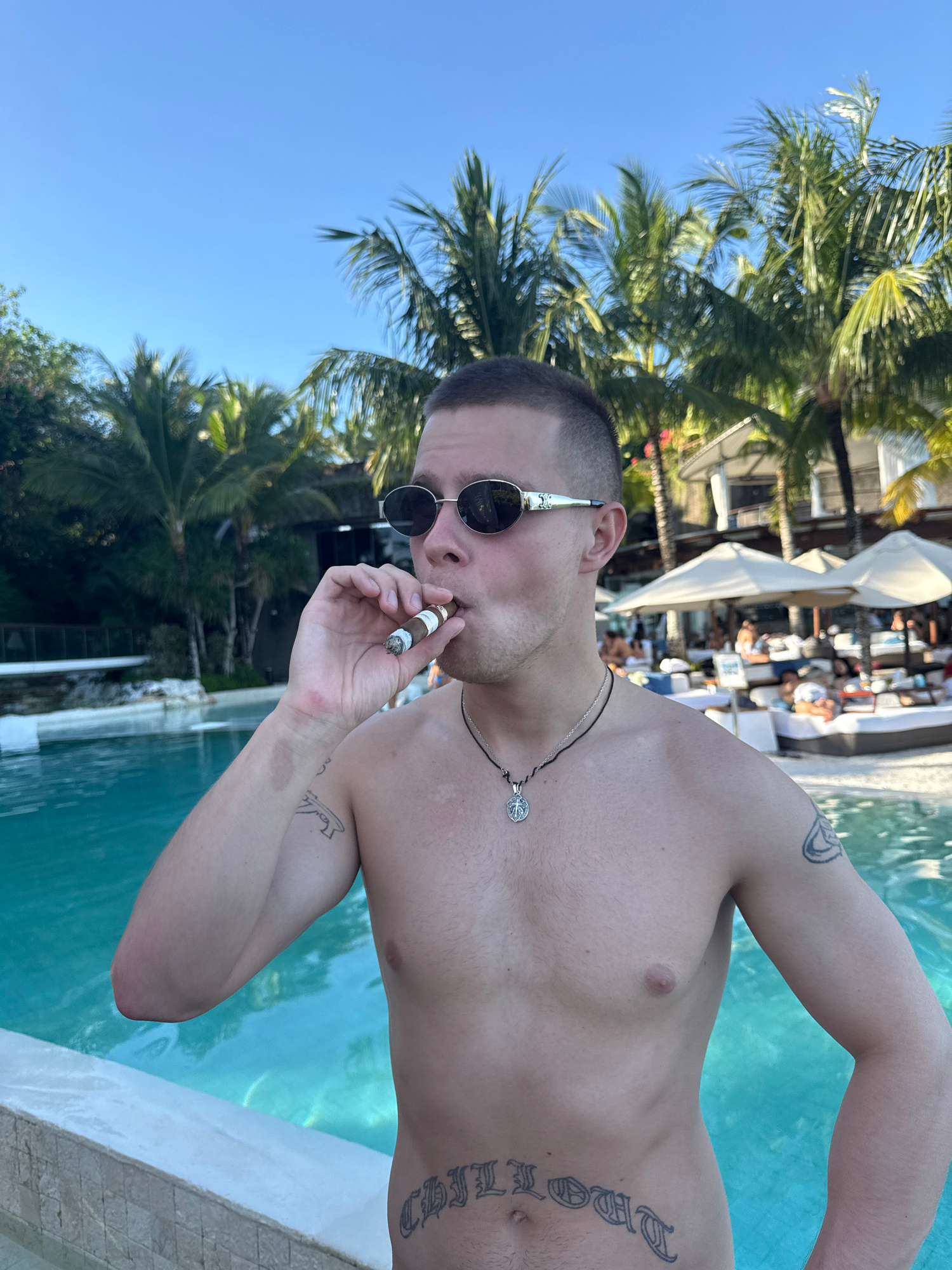 A fair-skinned man stands in a pool, shirtless and wearing sunglasses, smoking a cigar. The scene appears to be set outdoors at a resort or upscale pool area, evidenced by the clear blue water, palm t…read more