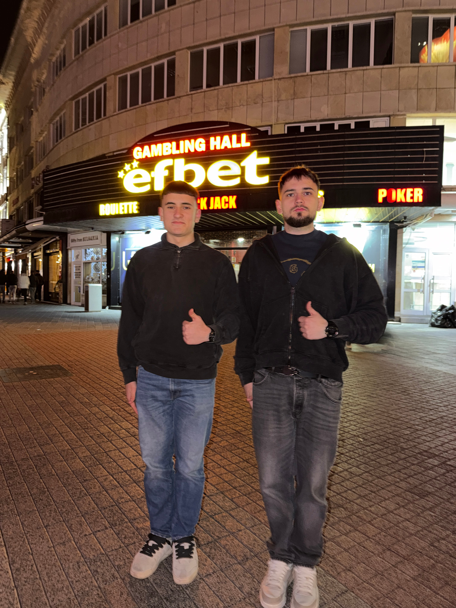 Two men are standing on a brick-paved walkway in front of a gambling hall called "efbet". The gambling hall has neon signs for "POKER", "BLACK JACK", and "ROULETTE". The building is multi-story and ha…read more