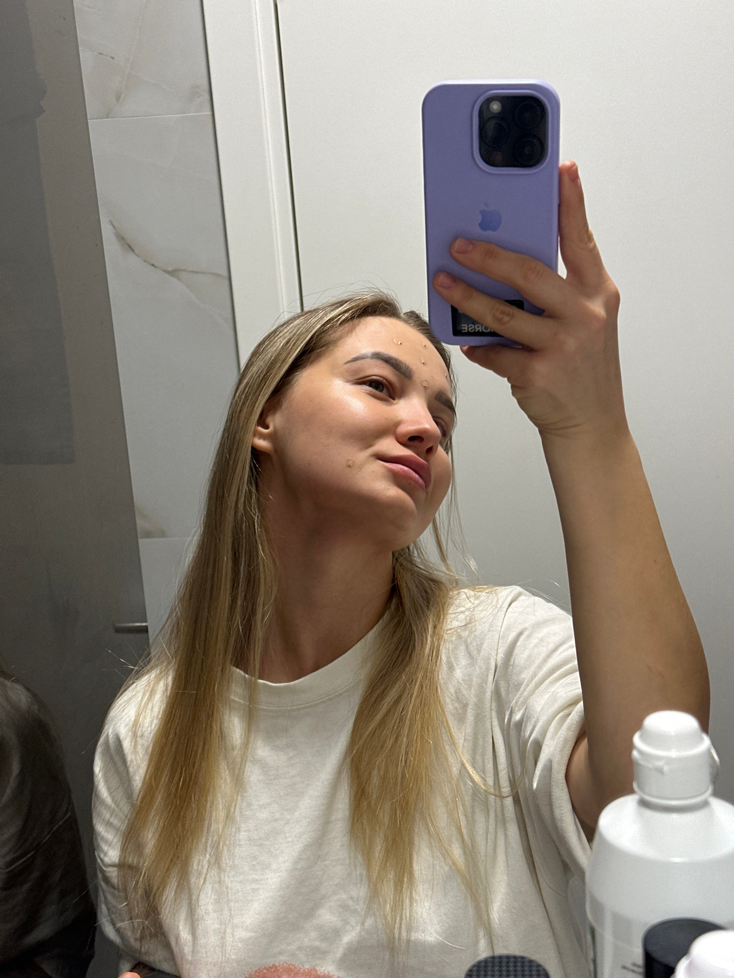 A blonde woman in a white t-shirt takes a selfie in a bathroom. She is holding a purple iPhone in her left hand and a white bottle in her right. There are water droplets on her face. The bathroom has…read more