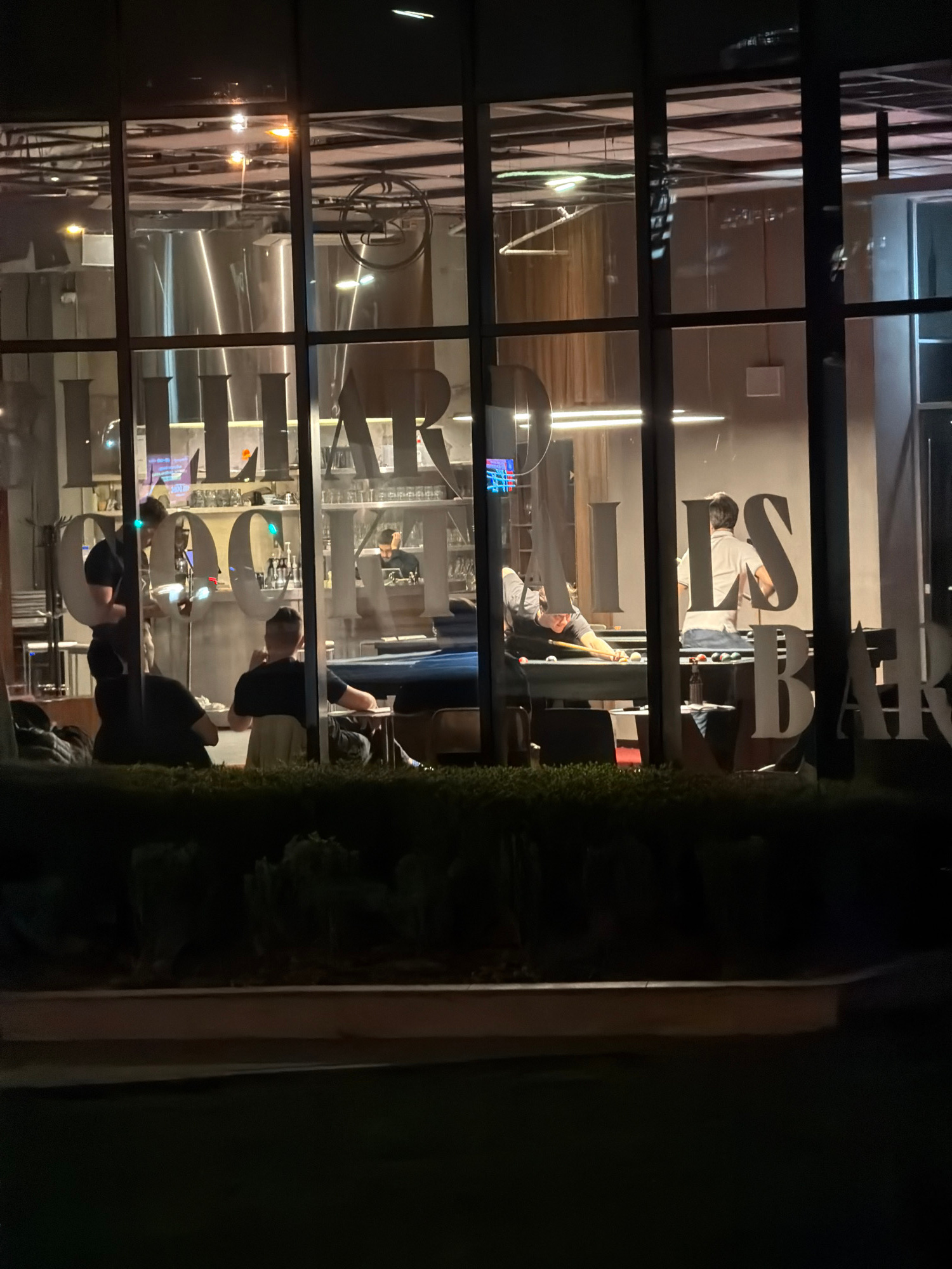 The image displays the interior of a billiard and cocktail bar viewed from outside at night through large glass windows. The establishment is the Kabinet Brewery & Billiard Cocktail Bar, located at Au…read more