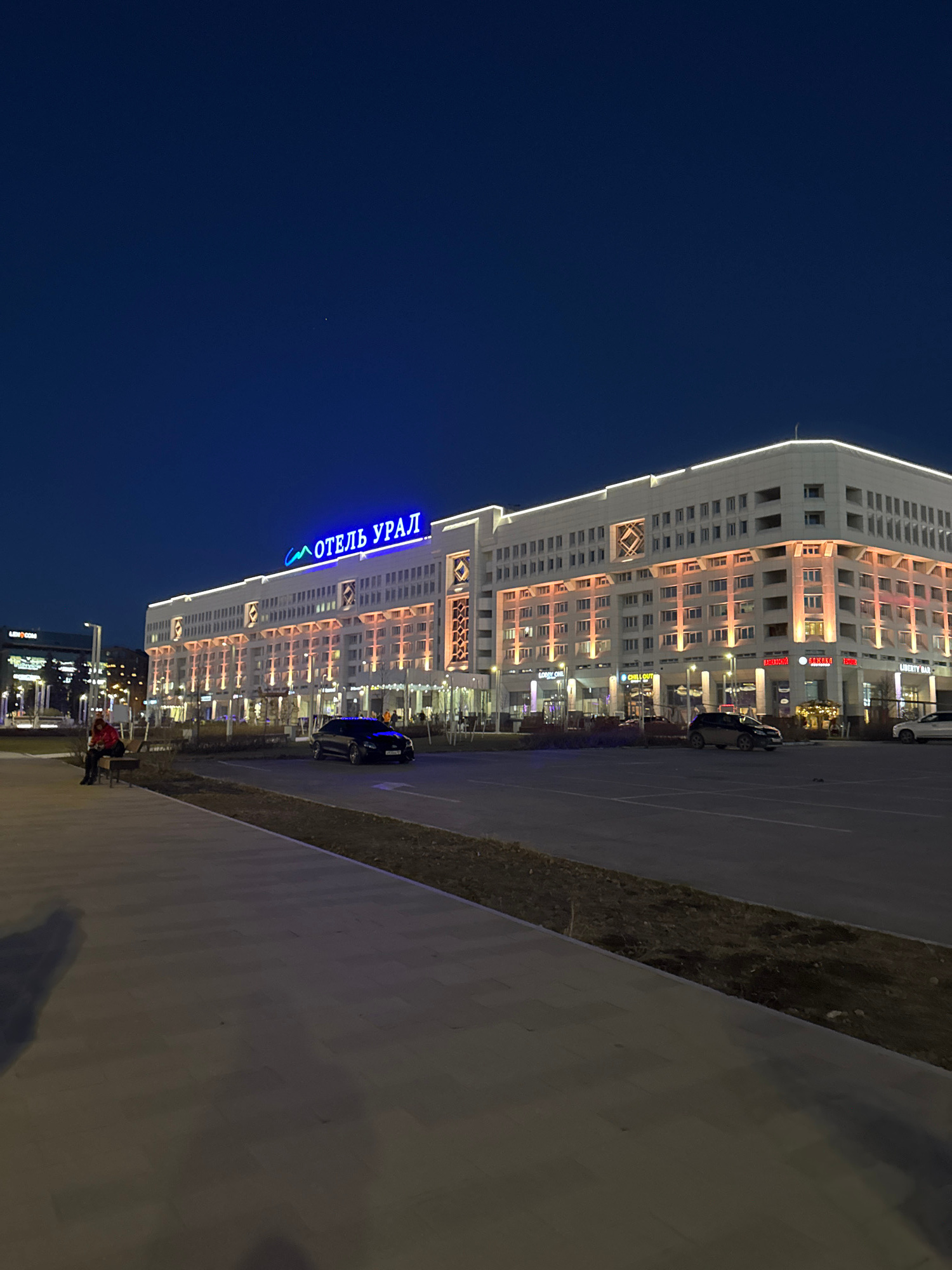 Here's a forensic description of the image: The image shows a street scene at night in Perm, Russia. The Hotel Ural is prominently visible with its blue neon sign in Russian Cyrillic script. The buil…read more