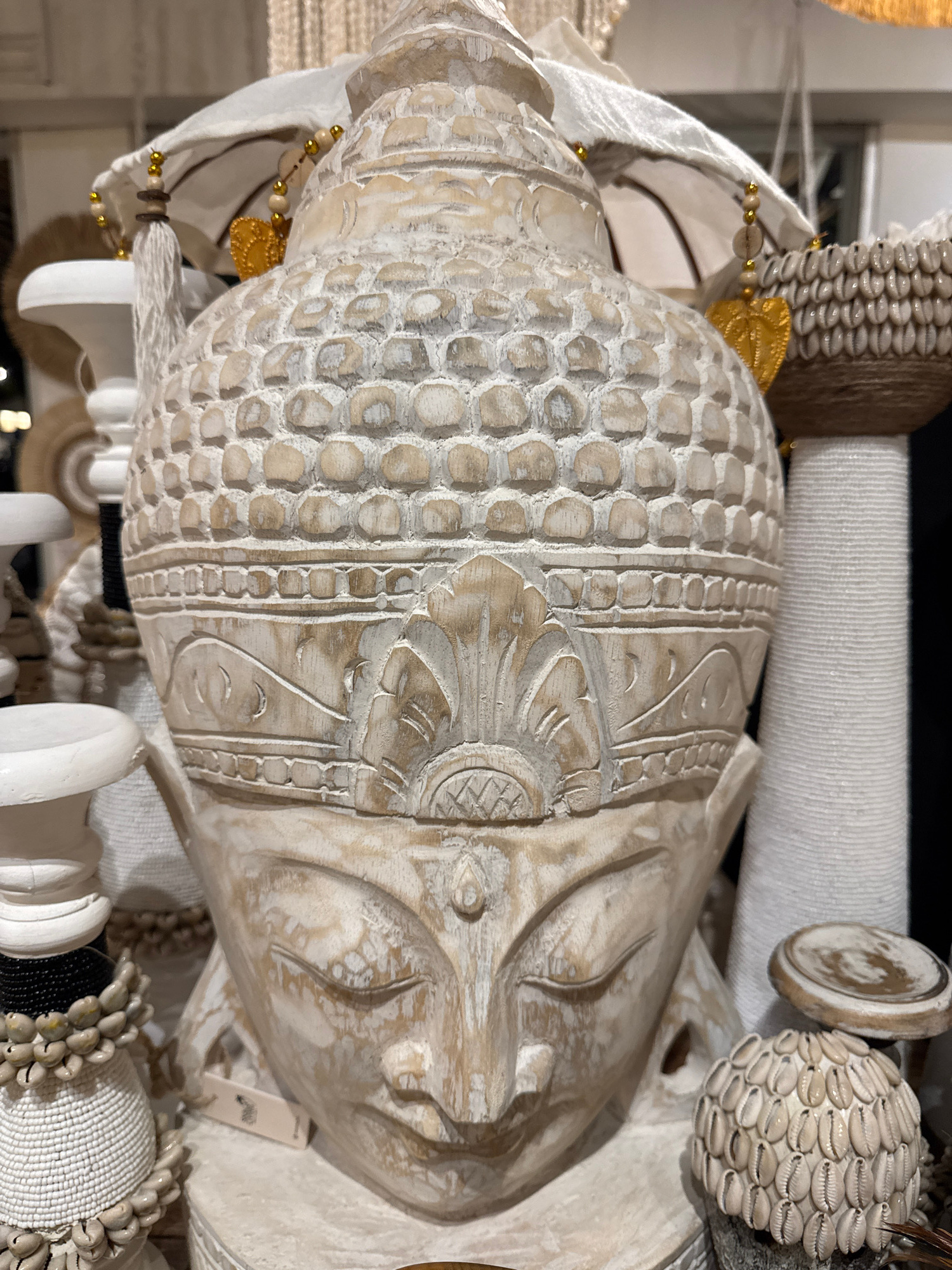 A close-up, slightly tilted view shows a carved wooden face, reminiscent of a Buddha or deity, amidst a collection of various decorative items. The face is light-colored and shows detailed carvings, i…read more