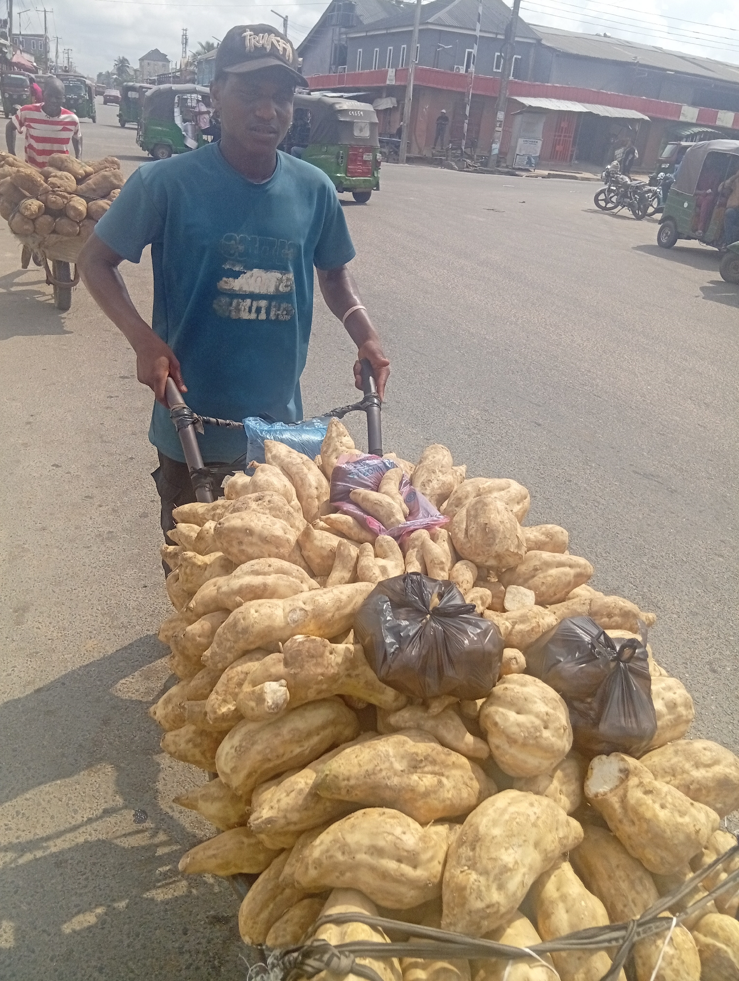 The image presents a dynamic street scene in Aba, Nigeria, under bright daylight. A young, dark-skinned man is the central subject, actively pushing a heavily laden handcart. He wears a blue t-shirt w…read more