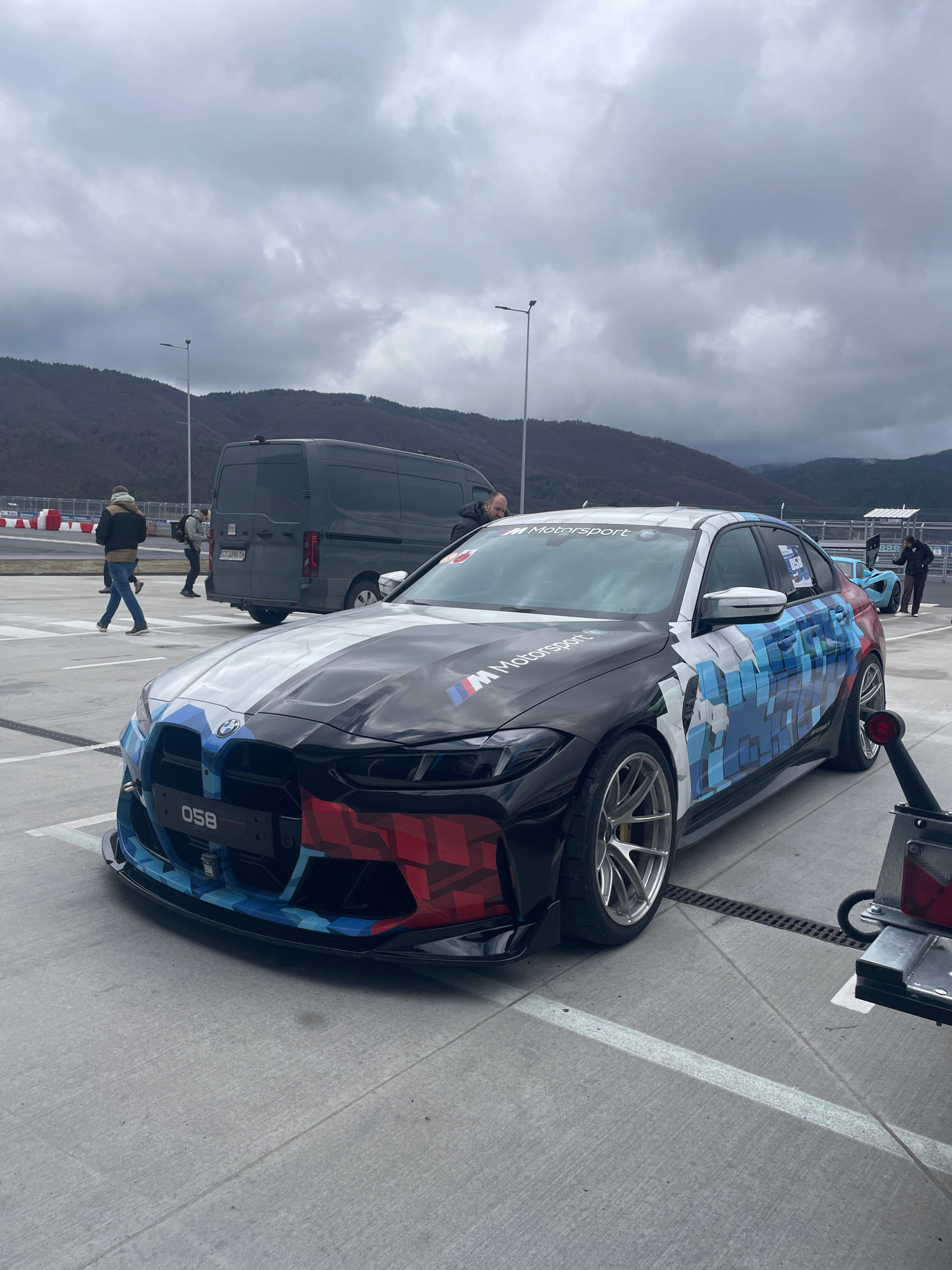 The image shows a BMW M5 CS with a pixelated camouflage wrap, parked on a concrete surface with parking lines. The car has aftermarket wheels and a front license plate reading "050". A grey van is par…read more