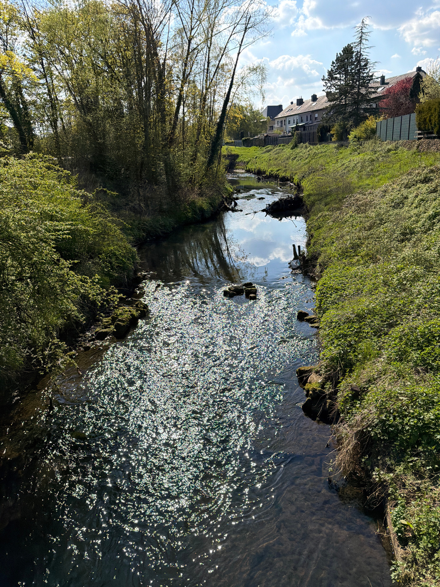 The image depicts a narrow waterway in Esch-sur-Alzette, Luxembourg. The water reflects sunlight, creating a shimmering effect. Lush vegetation covers the banks of the waterway. Houses and buildings a…read more