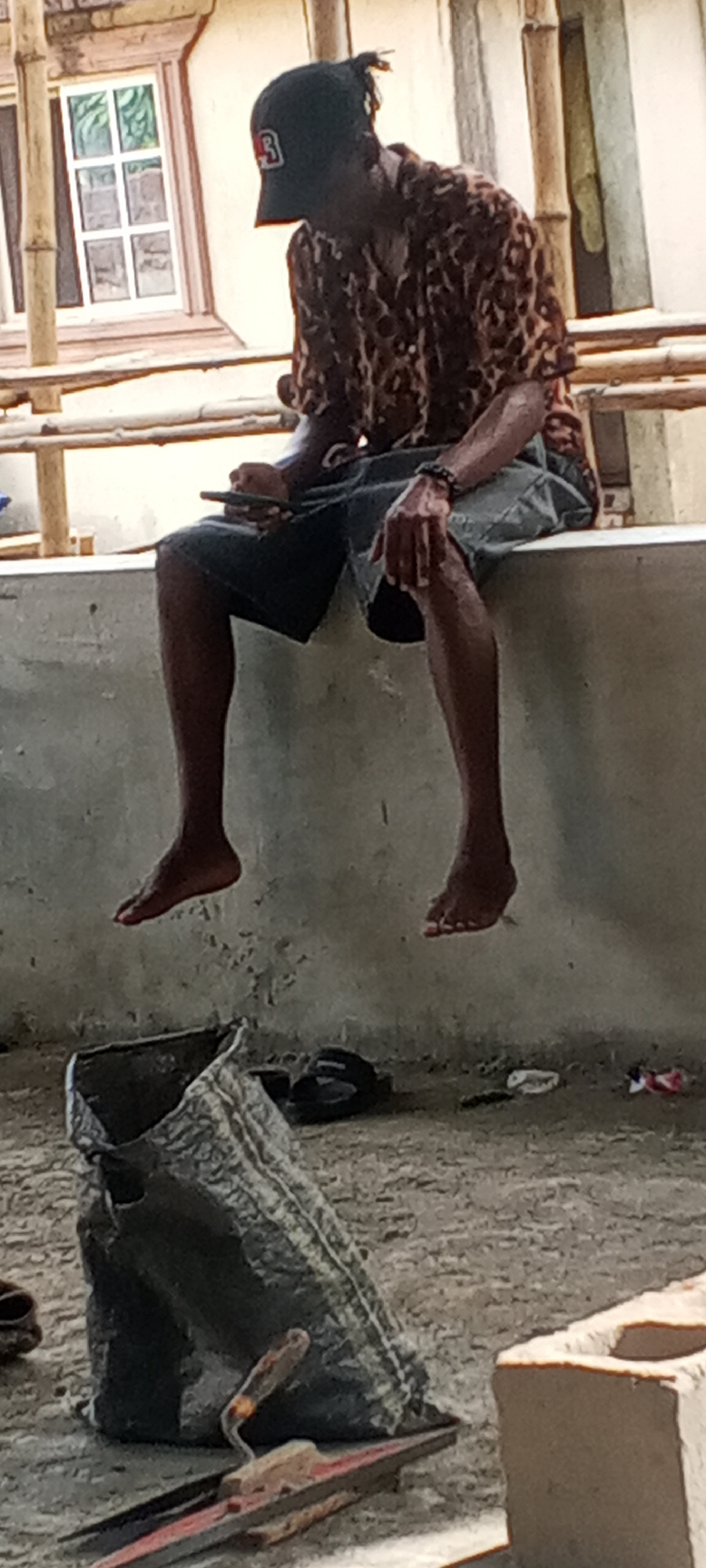 A person wearing a leopard print shirt and a black baseball cap is sitting on a concrete ledge, legs dangling, feet not touching the ground. The individual is holding a mobile phone in their left hand…read more