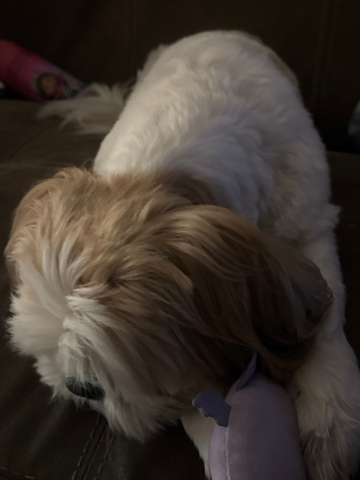 A small, bicolored dog, displaying primarily white fur with light brown or tan markings on its head and ears, is positioned lying on a dark brown upholstered surface, likely a sofa. The dog's head is…read more