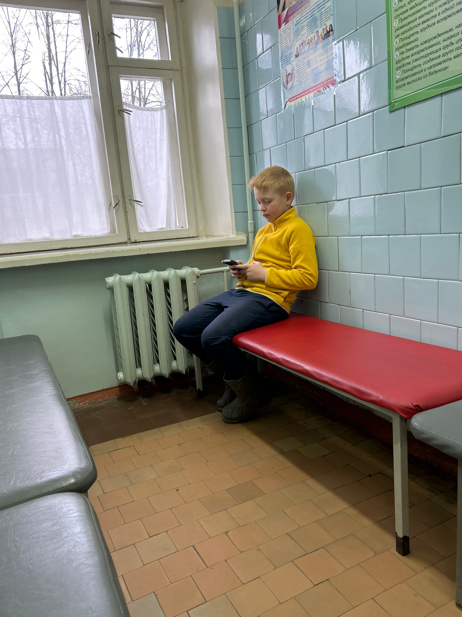 Here's a detailed description of the image: **Scene:** An indoor waiting area, possibly a clinic or hospital, based on the tile walls and type of seating. **Location:** Likely in Chaikovsky, Russia,…read more