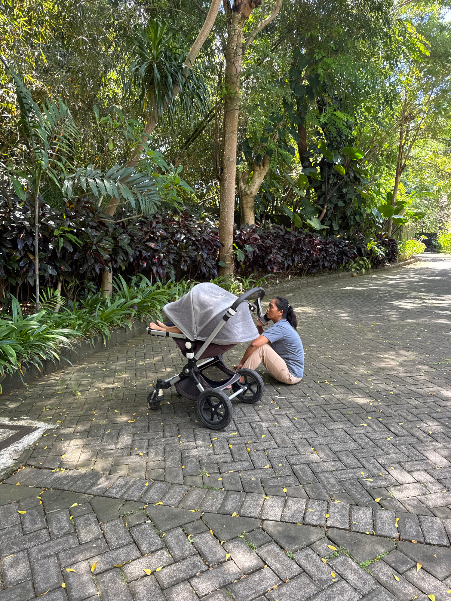 This image depicts an outdoor scene in what appears to be a lush tropical environment, consistent with the Kuta Selatan region of Indonesia. The main subjects are an adult individual and a baby strollβ¦read more