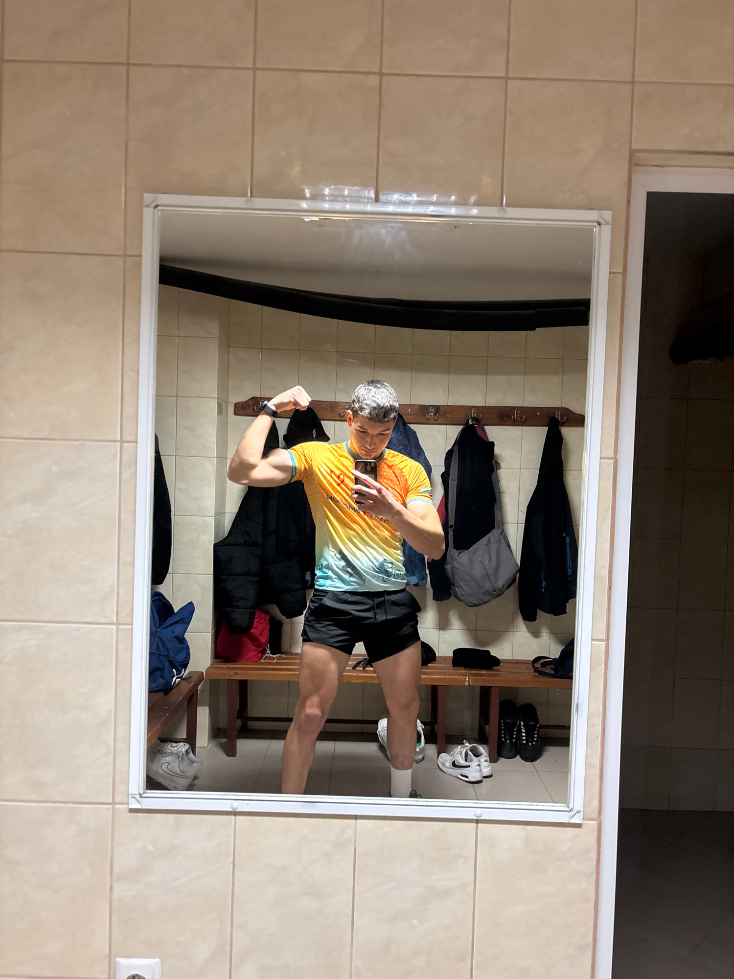 A person is reflected in a mirror in a hallway. The hallway has a coat rack with various items of clothing and shoes. The walls are tiled in a light brown color. There is an electrical outlet visible.…read more
