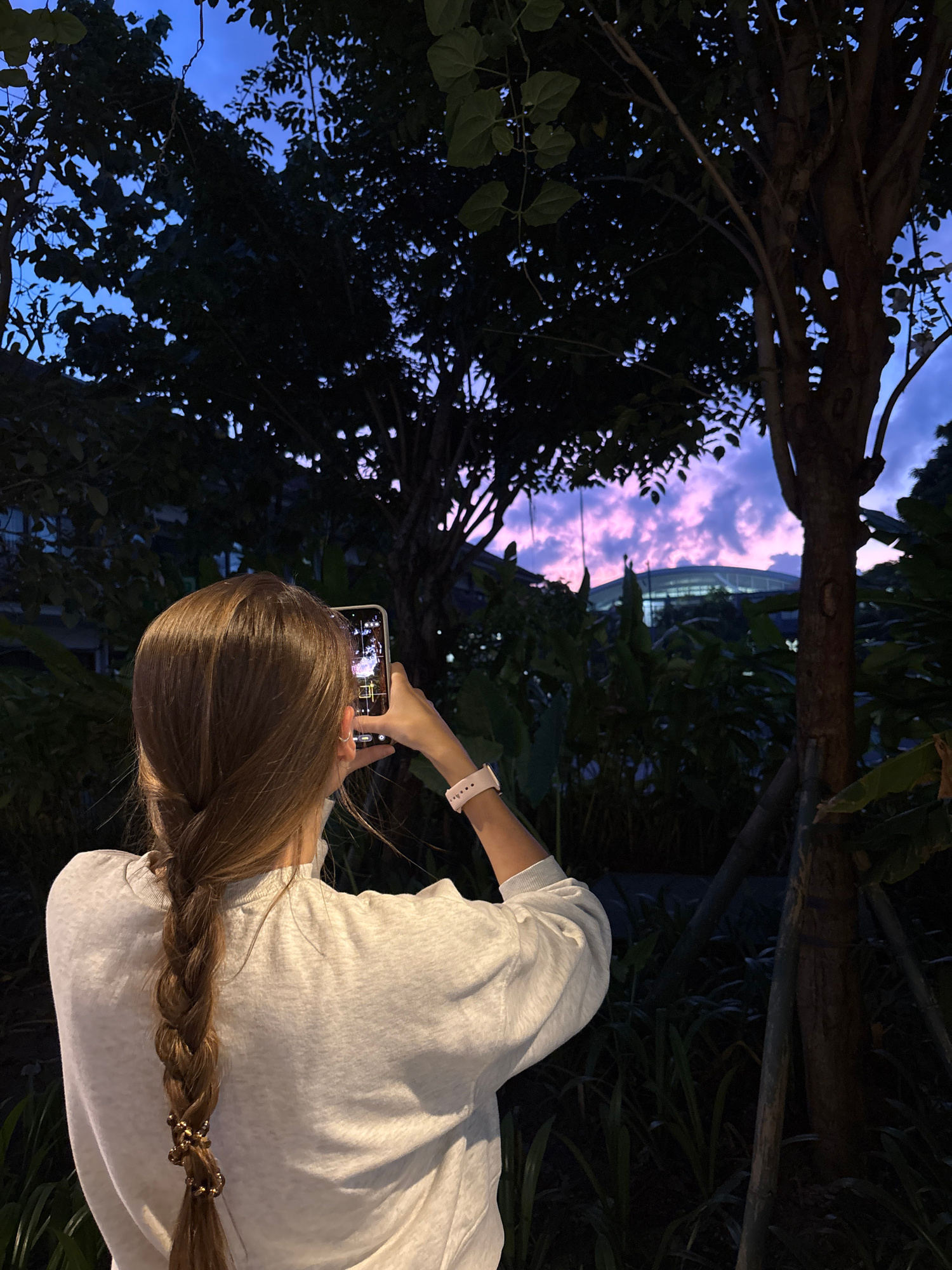 A woman with blonde hair in a braid, wearing a white shirt, is holding a smartphone up, taking a picture of the sky at twilight. The sky visible through the tree branches is a mix of blues and pinks.…read more
