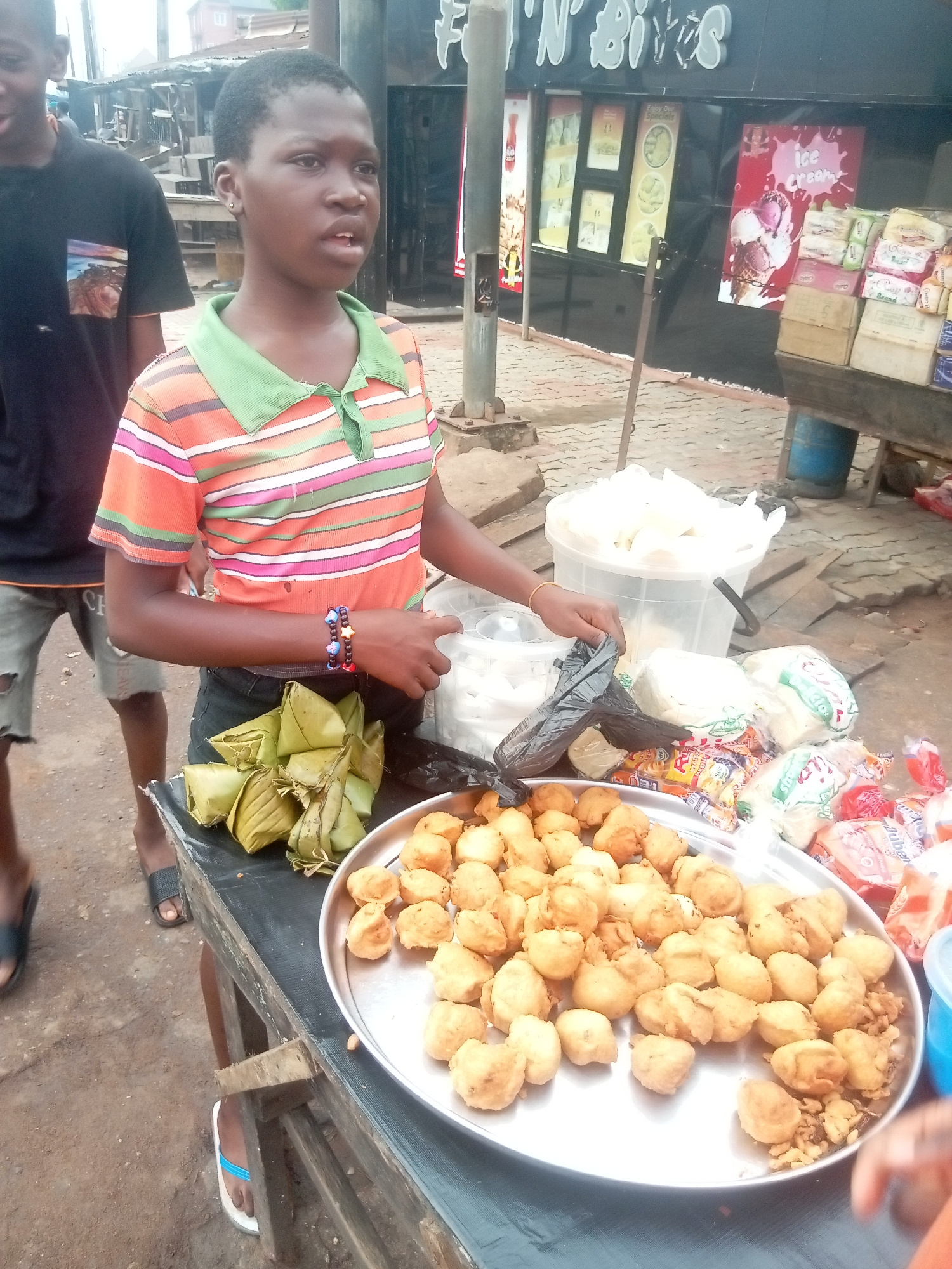 A young person stands behind a table displaying food items in Nkpor, Nigeria. The individual is wearing a striped orange, white, and green shirt. They have two bracelets on their left wrist. The table…read more