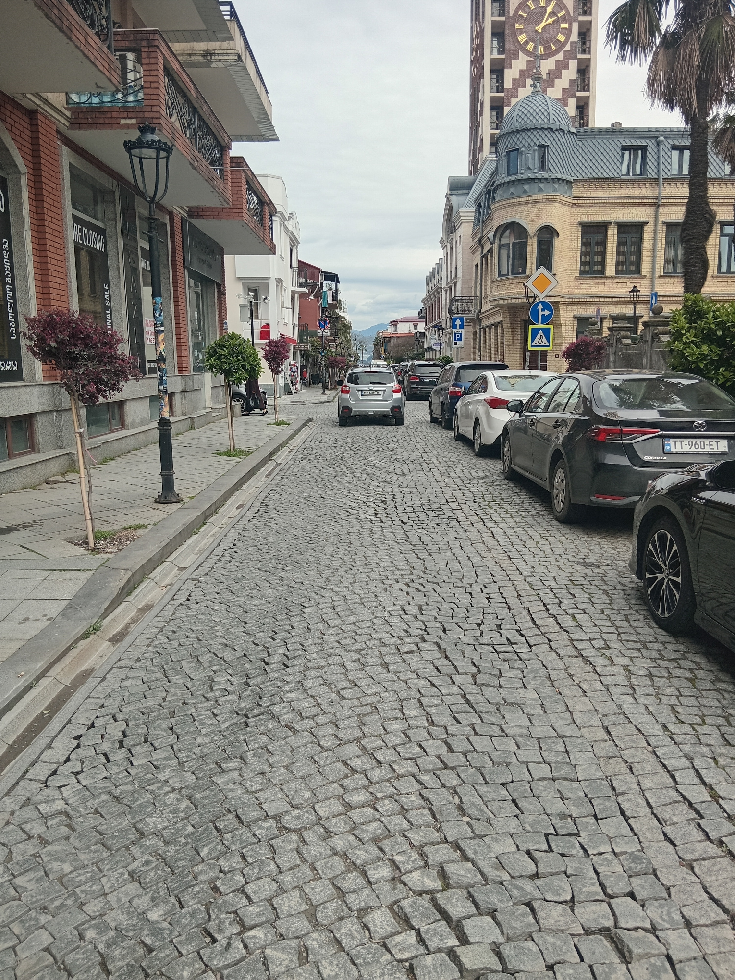 Here is a detailed description of the image: The image captures a street scene in Batumi, Georgia, characterized by its cobblestone pavement and architectural details. A row of parked cars lines the…read more