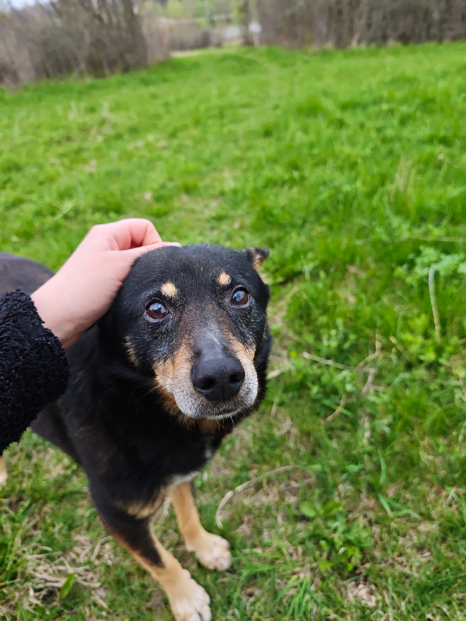 A medium-sized, short-haired dog with black fur and tan markings on its legs and face is being petted on the head by a human hand. The dog has a grey muzzle and brown eyes. The setting is an outdoor a…read more