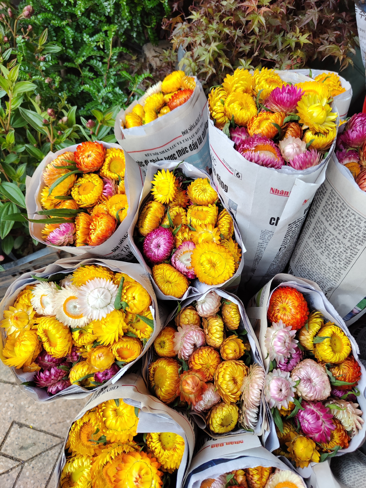 The image captures a close-up of several bouquets of colorful flowers wrapped in newspaper, likely taken in Da Lat, Vietnam. The flowers are predominantly yellow, orange, pink, and white, with texture…read more