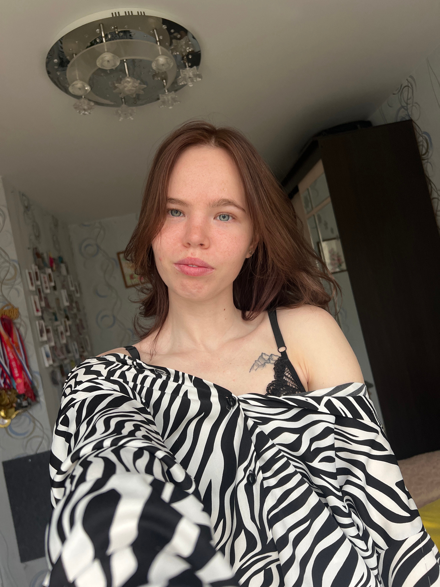 The image displays a young woman posing for a photo in an indoor setting, identified as Chaikovsky, Russia. The photo is rotated 90 degrees clockwise, showing the woman lying on her side, looking dire…read more