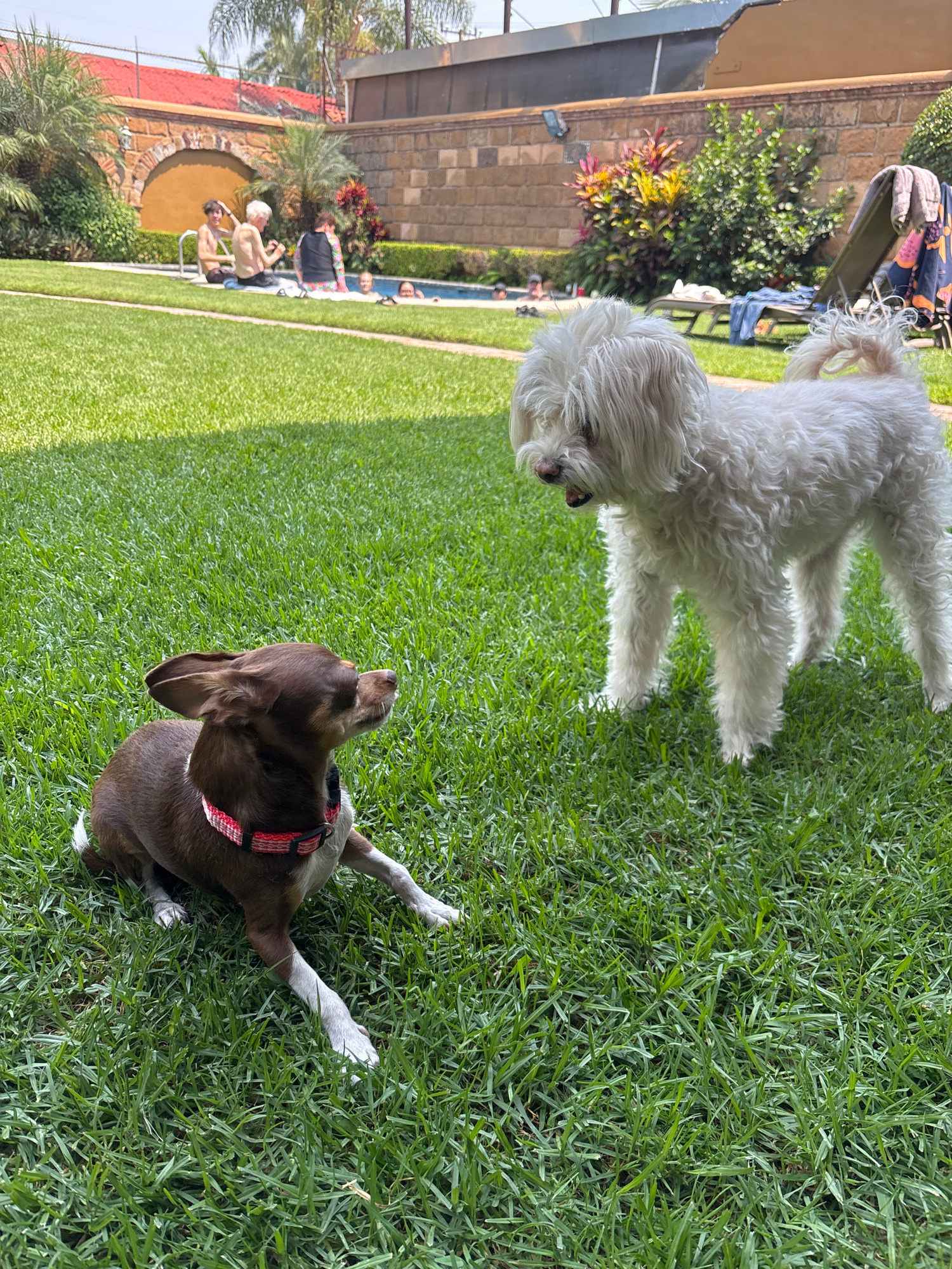 The image shows two dogs on a green lawn. One dog is white and fluffy, facing towards the top left of the frame. The other dog is brown with white paws, wearing a red and white collar, and is looking…read more