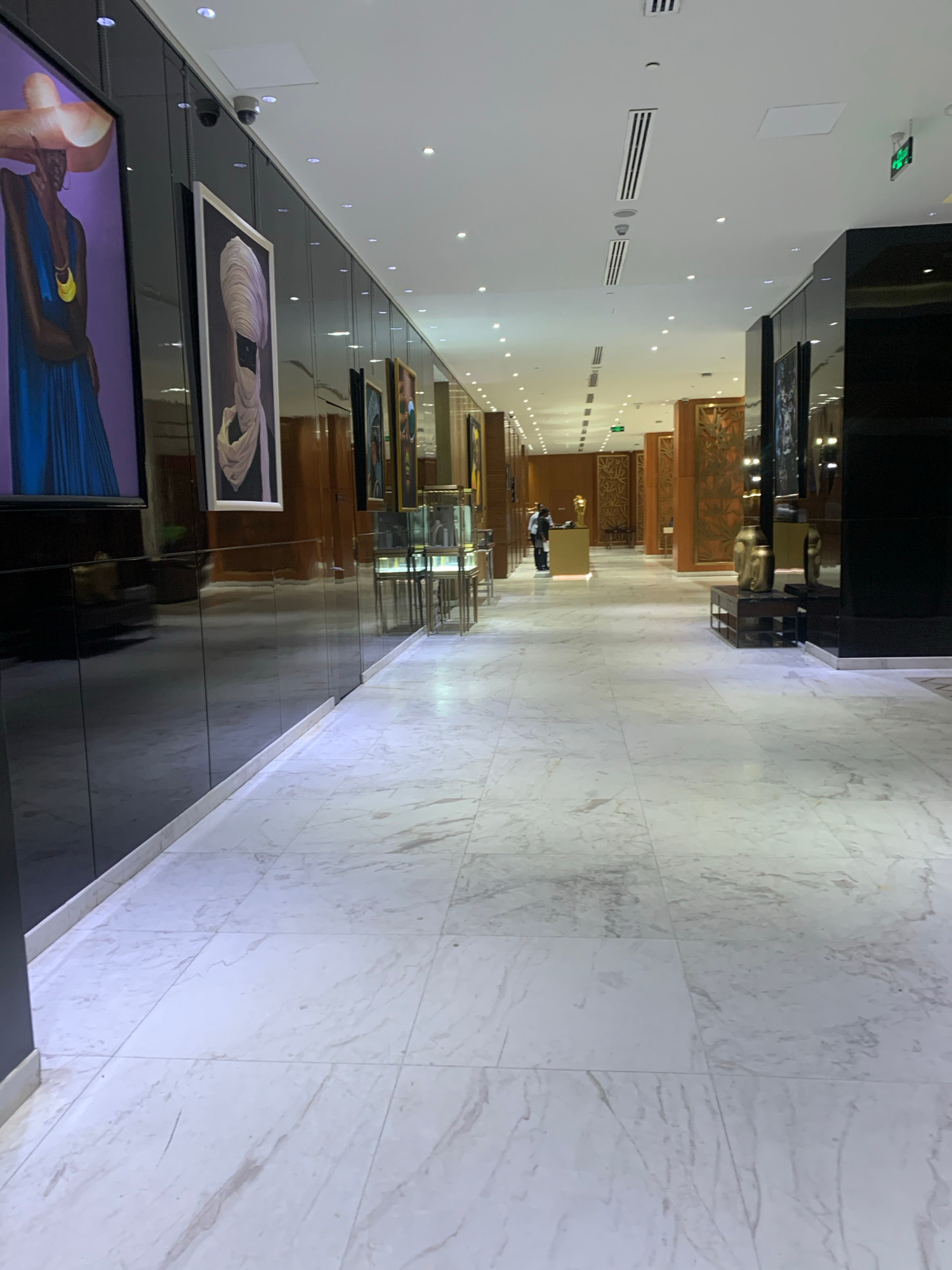 The image shows an interior hallway in a high-end establishment, likely a hotel or gallery in Dar es-Salaam, Tanzania. The hallway features a marble-tiled floor and a wall decorated with framed artwor…read more