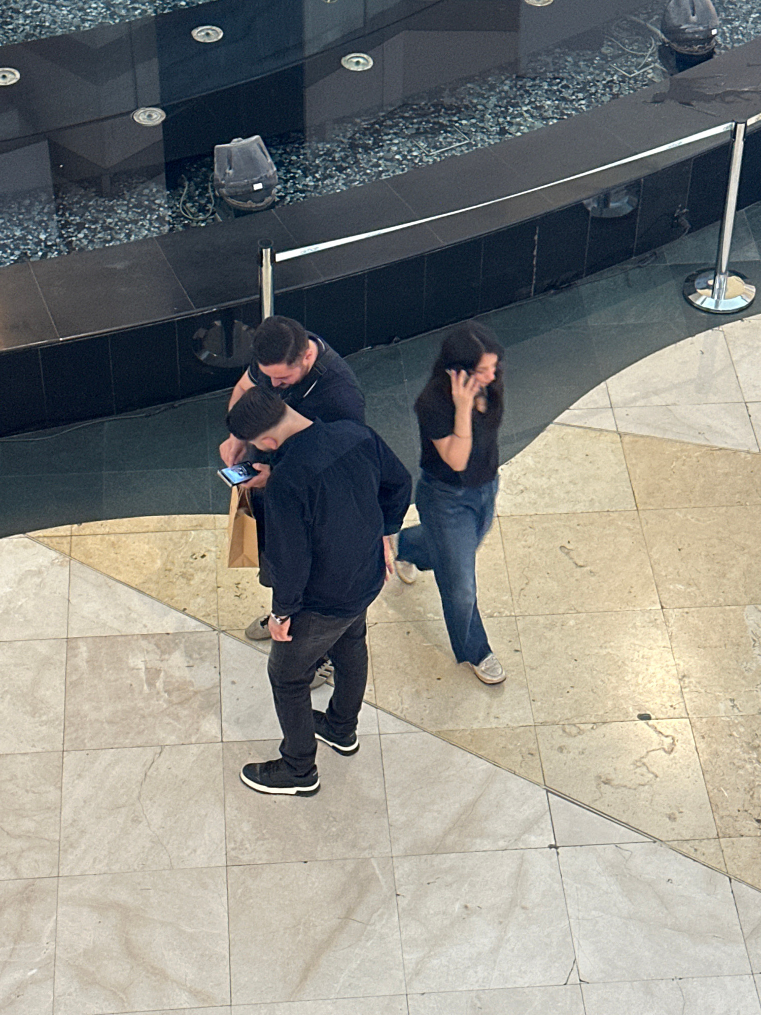 Two men and a woman stand on a tiled floor near a large black structure with water features. The men are dressed in dark clothing and are looking at a mobile phone. The woman is in a dark top and jeanβ¦read more