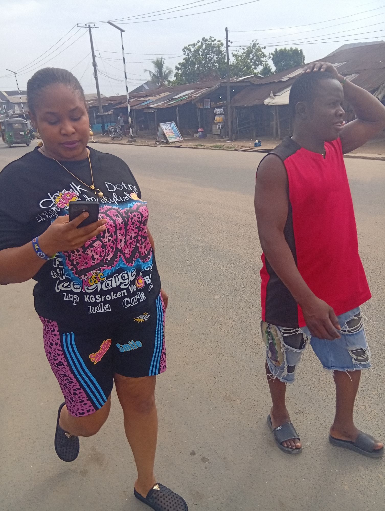 Two individuals walk on a paved road, likely a street, in what appears to be a market area in Umuode, Nigeria. The woman on the left, wearing a black t-shirt with colorful graphics and matching shorts…read more