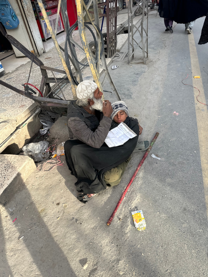 The scene depicts two individuals, an elderly man and a young child, situated on a paved sidewalk or roadside in an urban environment, specifically in Quetta City Tehsil, Pakistan. The elderly man, di…read more