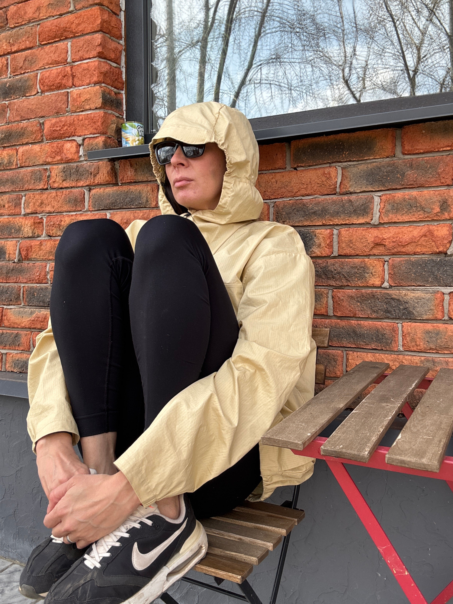 An individual is depicted sitting outdoors in Chaikovsky, Russia, with their body oriented towards the viewer's left. They are wearing a light beige or yellow hooded jacket pulled over their head, bla…read more