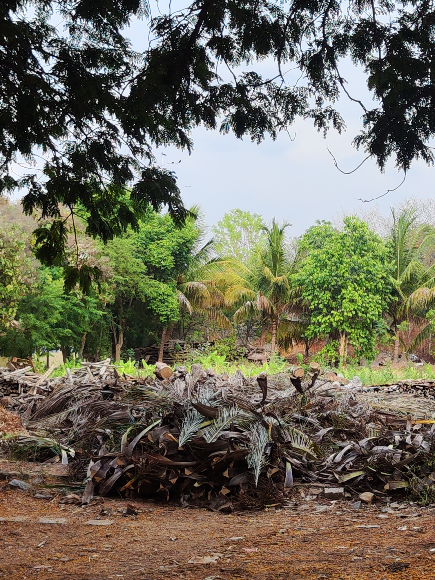 The image presents a view of a natural landscape in Puttaparthi, India. The scene is framed by foliage, with a dark, dense tree on the left and a collection of dry, brown vegetation on the right. The…read more