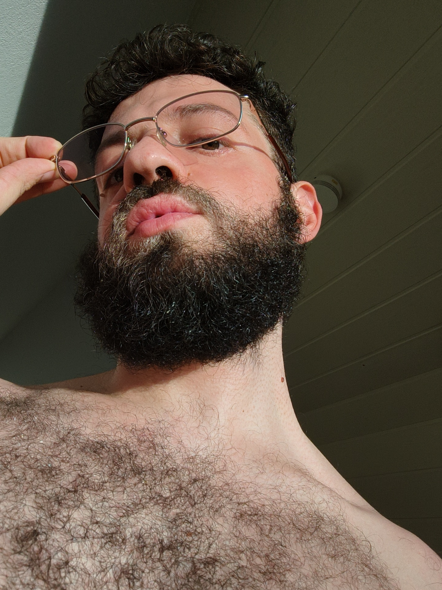 A man is shown in a low-angle, close-up shot. He has dark, curly hair, a full beard, and is wearing gold-rimmed glasses. His right hand is holding the frame of the glasses away from his face. He is sh…read more