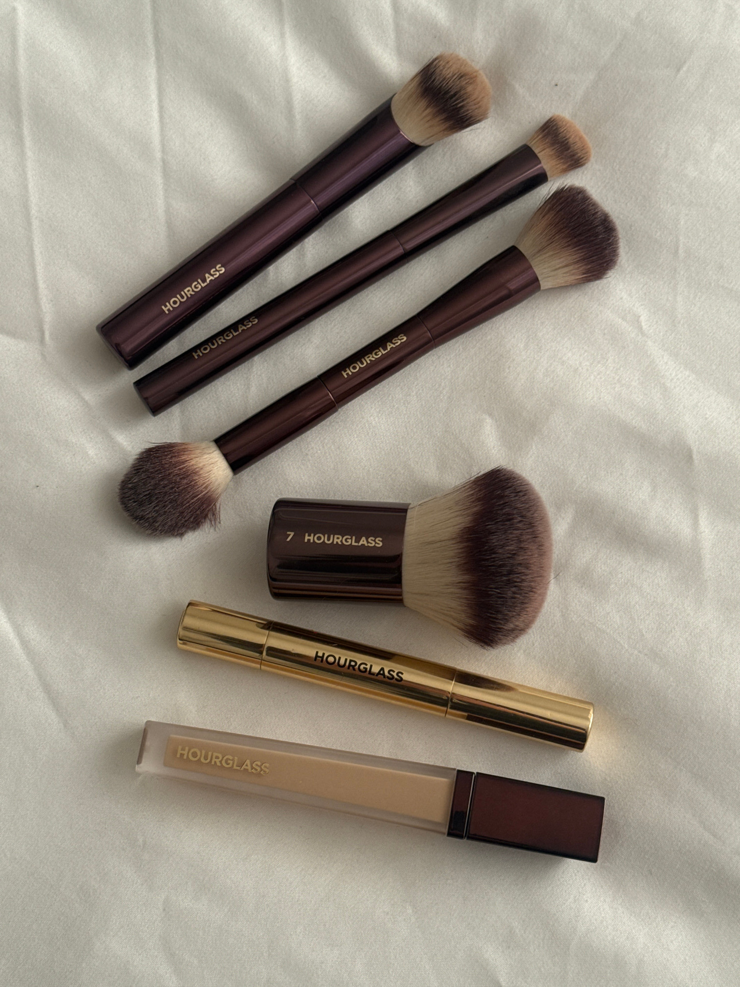The image shows a collection of Hourglass brand makeup products on a white textured surface. There are four makeup brushes with brown handles and varying brush head shapes and sizes. Additionally, theβ¦read more