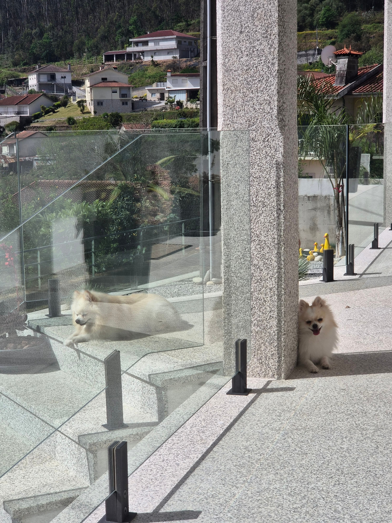 A small, white, fluffy dog is resting on a stone surface, possibly a wall or a step, next to a glass railing. The dog's tongue is visible. The railing overlooks a residential area with houses nestled…read more