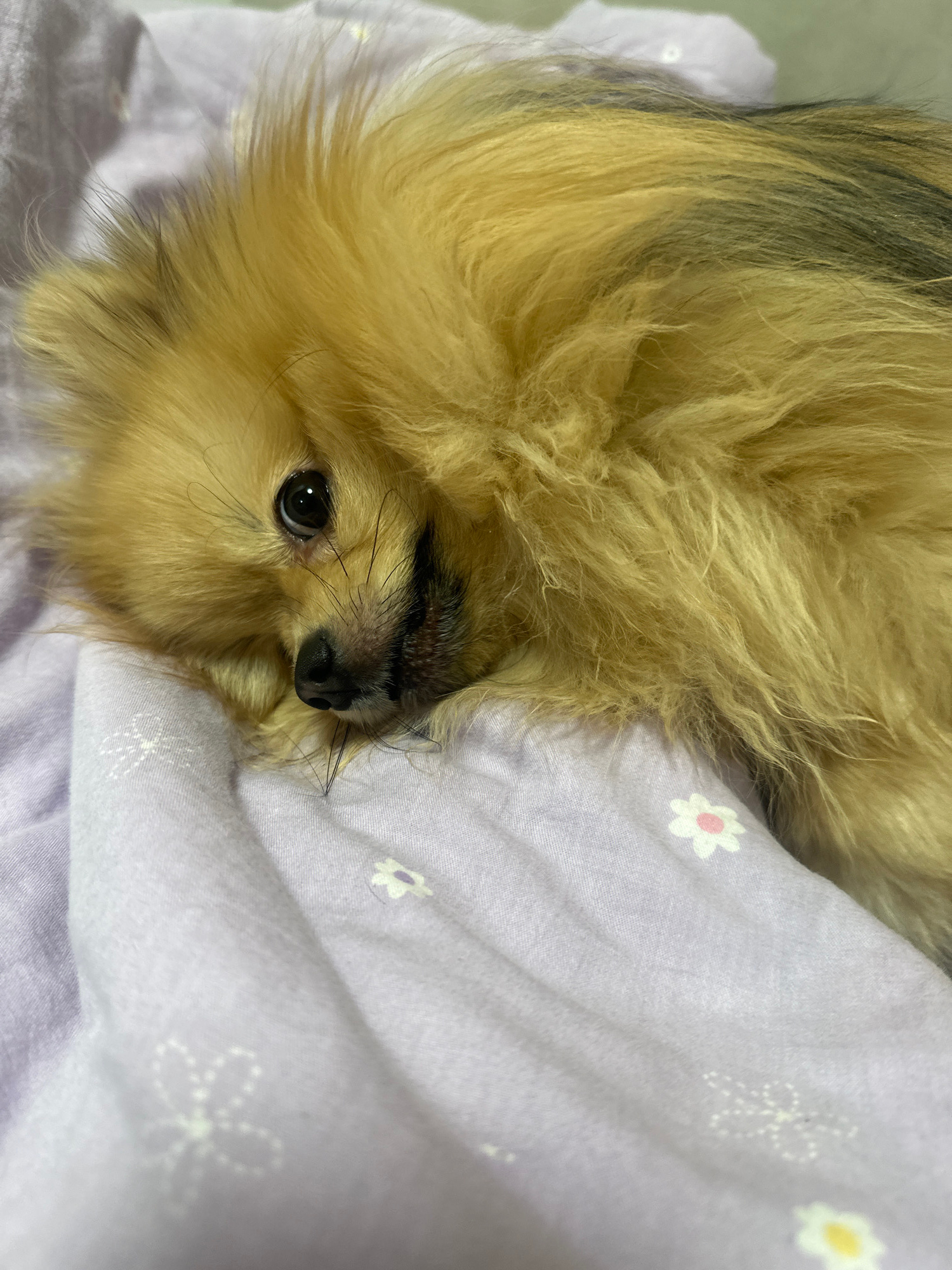 A close-up, top-down shot depicts a Pomeranian dog nestled in light purple bedding patterned with white floral designs. The dog's face is prominent, featuring dark eyes, a shiny black nose, and long w…read more