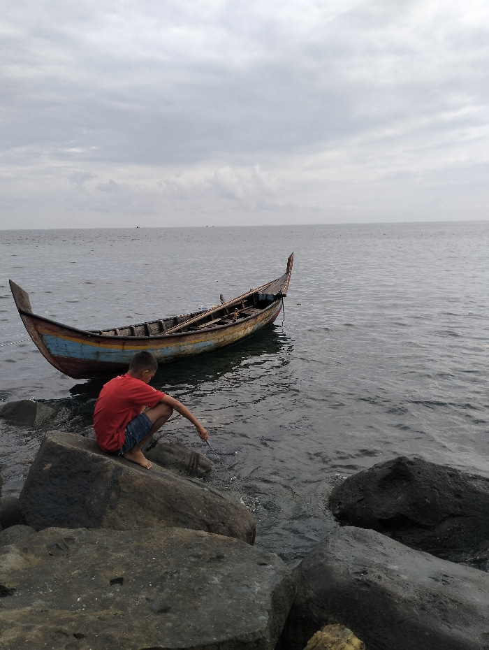 A young boy in a red shirt and blue shorts sits on dark rocks at the edge of the water, possibly fishing with a stick. An old, colorful wooden boat rests on the water's surface nearby. The sea is calm…read more