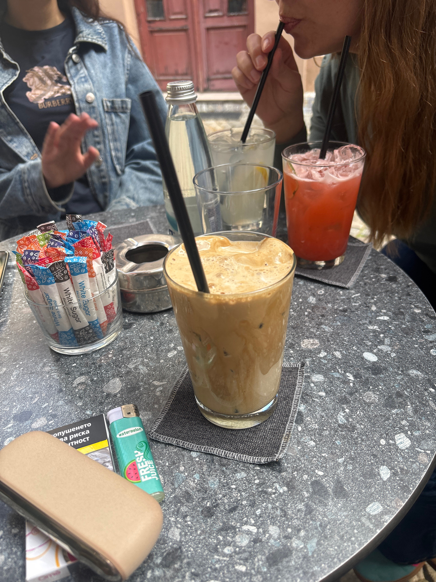 The image shows a close-up of a café table in Plovdiv, Bulgaria, with multiple drinks and personal items. Two individuals are partially visible, enjoying beverages. One person with long, reddish-brown…read more