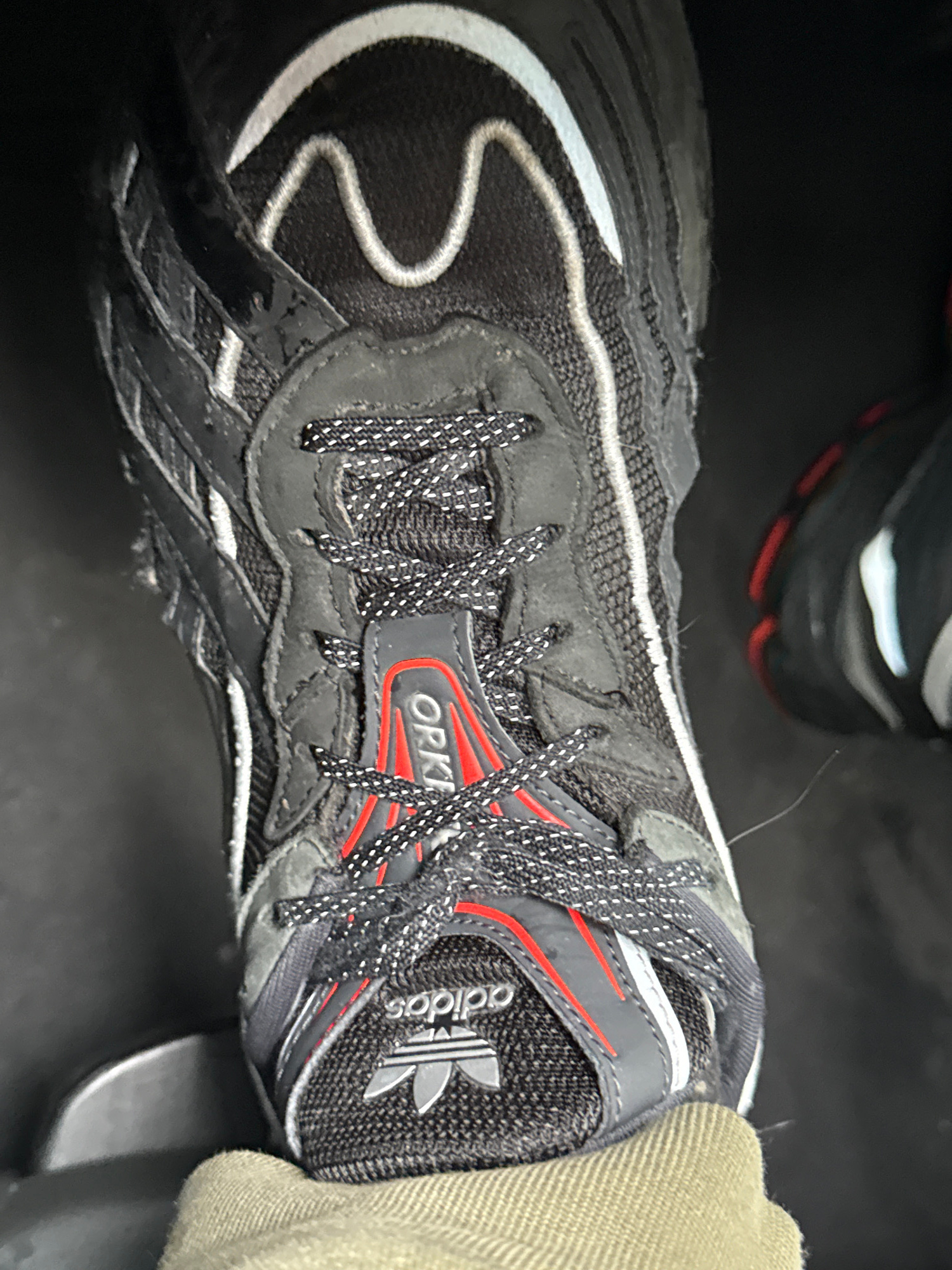 A close-up shot shows an Adidas Orketro sneaker on a person's foot. The shoe is predominantly black with white and red accents. The shoelaces are black with white speckles. The "Orketro" brand name is…read more