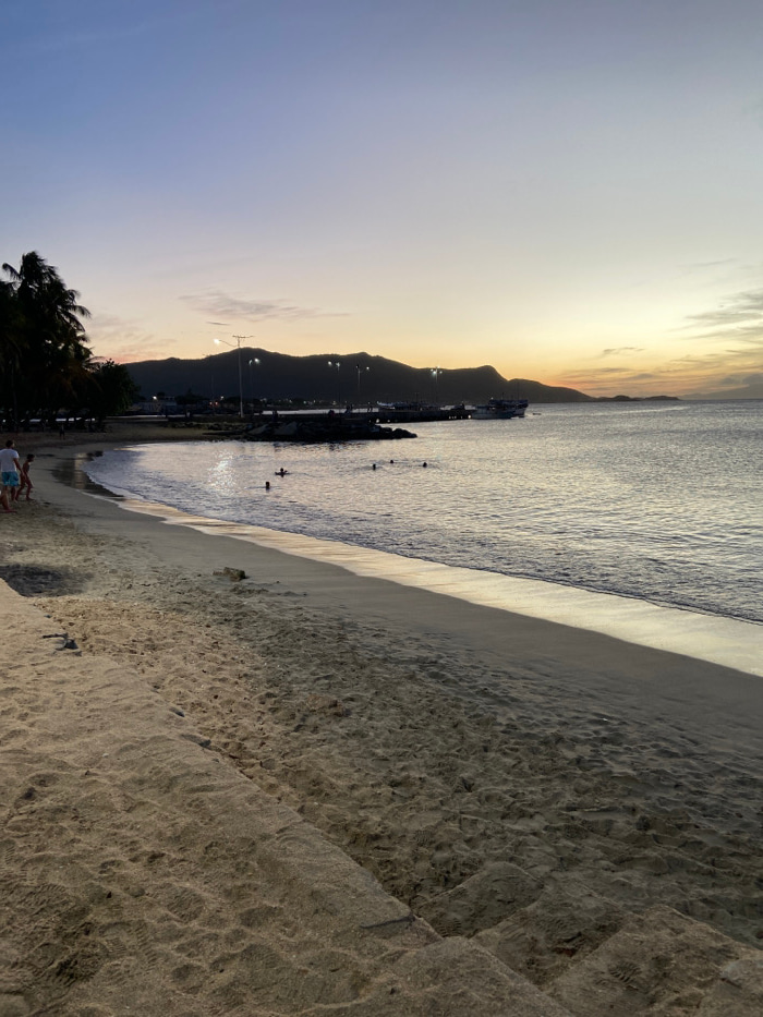 A beach scene at sunset features a dark mountain range with lights illuminating its slope. A pier extends into the ocean, where several people are swimming. The sky transitions from blue to orange. Sa…read more