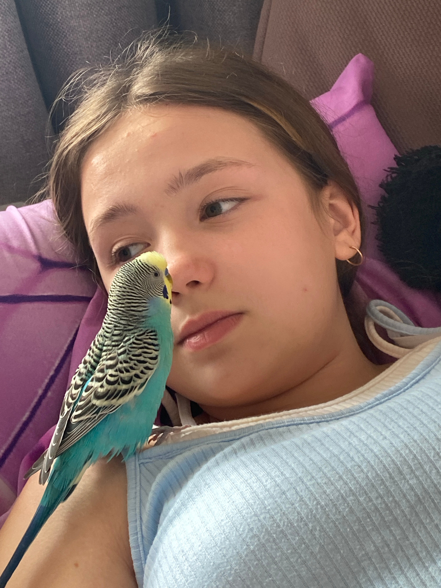 A young girl with light brown hair is lying on a purple pillow with a gray couch behind her. She is wearing a light blue top. A blue parakeet is perched on her and appears to be touching its beak to hβ¦read more
