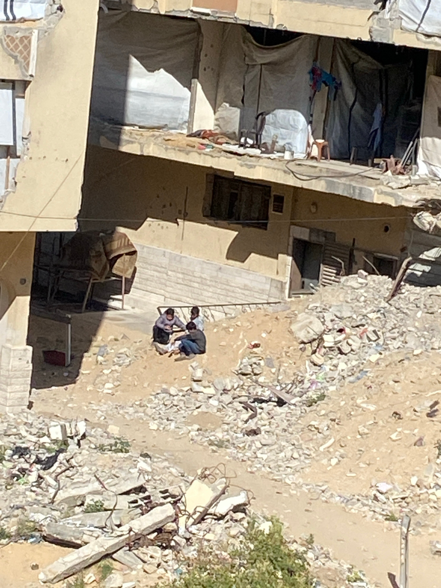 This overhead view captures a scene of extensive destruction in Khan Yunis, Palestinian Territory. The environment is dominated by remnants of damaged buildings and vast areas of rubble. On the left s…read more