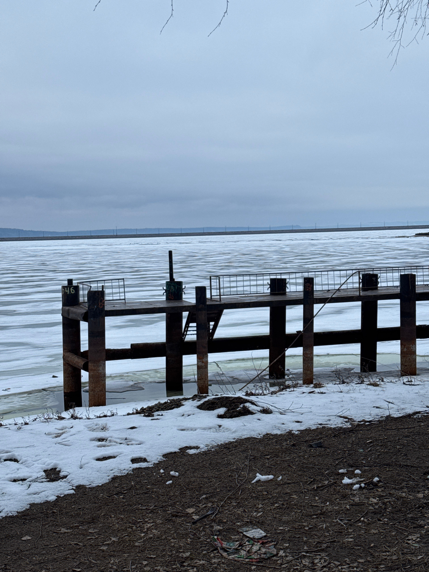 The image depicts a waterfront scene in Chaikovsky, Russia. A partially frozen body of water stretches into the distance under an overcast sky. A dark, rusted, metal pier-like structure with a ladderβ¦read more