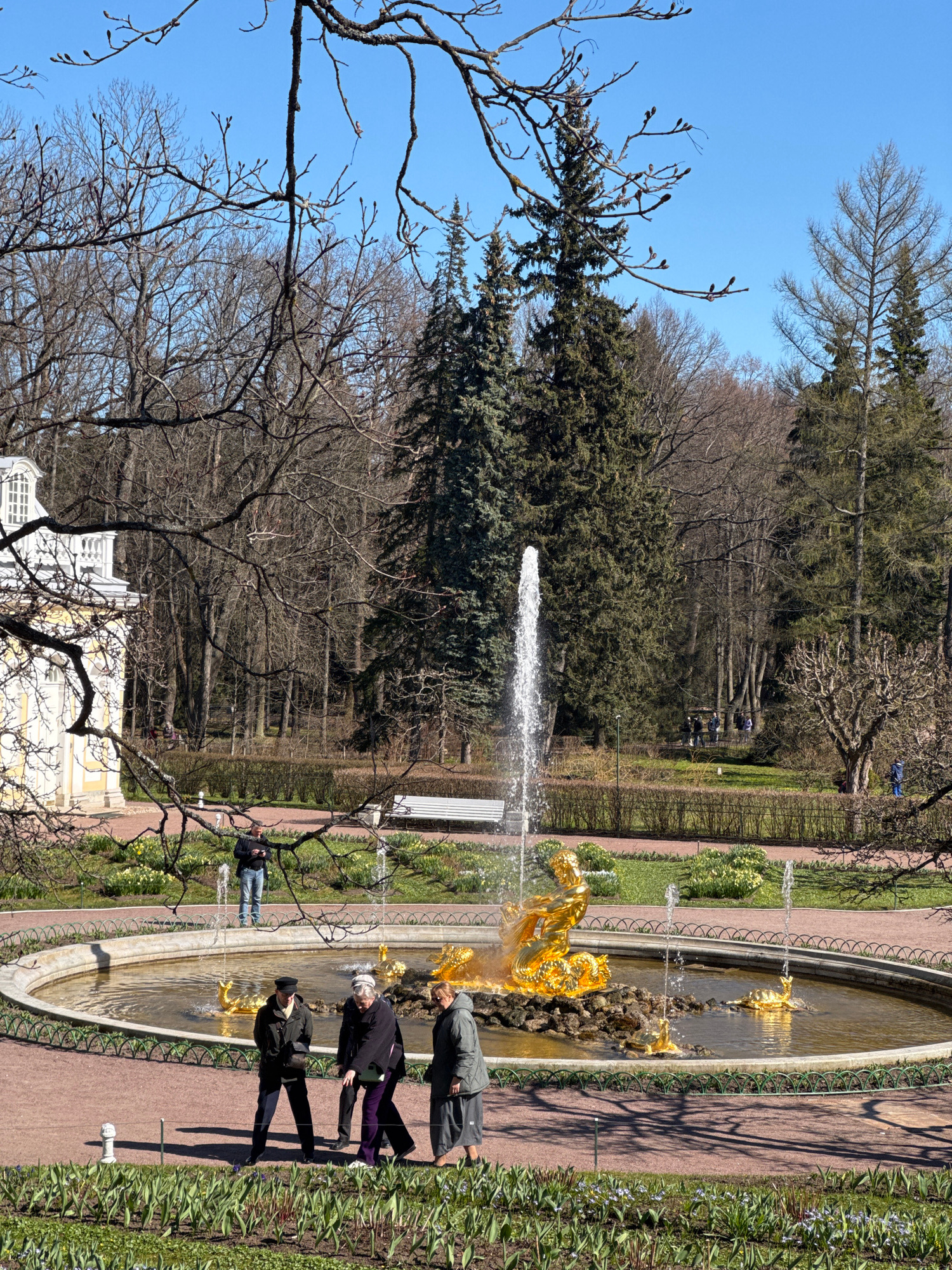 This media file captures an outdoor scene at Peterhof, Russia, featuring a grand fountain as the central subject. The image is taken on a clear, sunny day, evidenced by the bright blue sky and distinc…read more