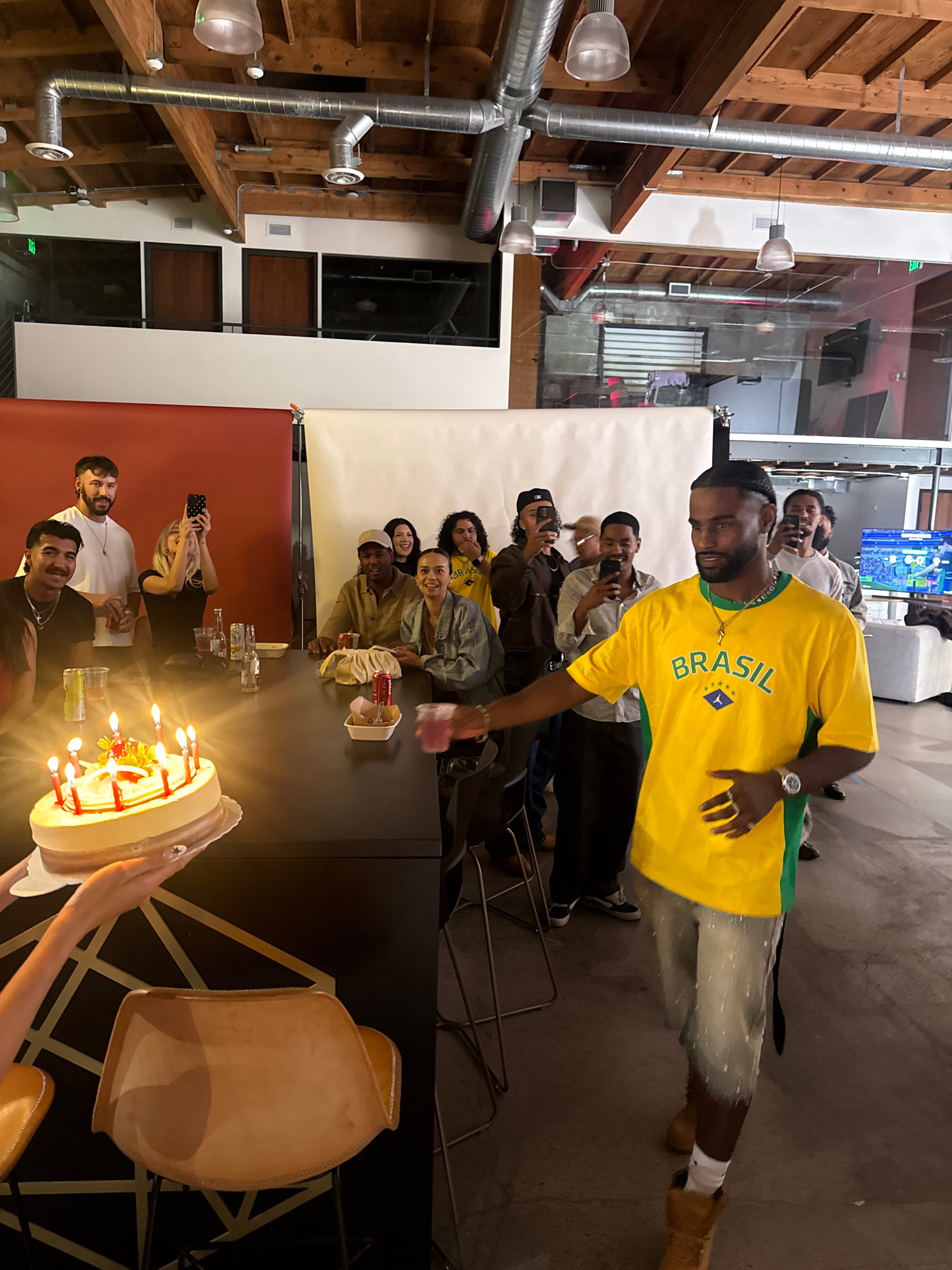 The scene is an indoor celebration, potentially a birthday, in what appears to be a commercial or industrial space converted for event use, possibly in Culver City, United States of America. The archi…read more