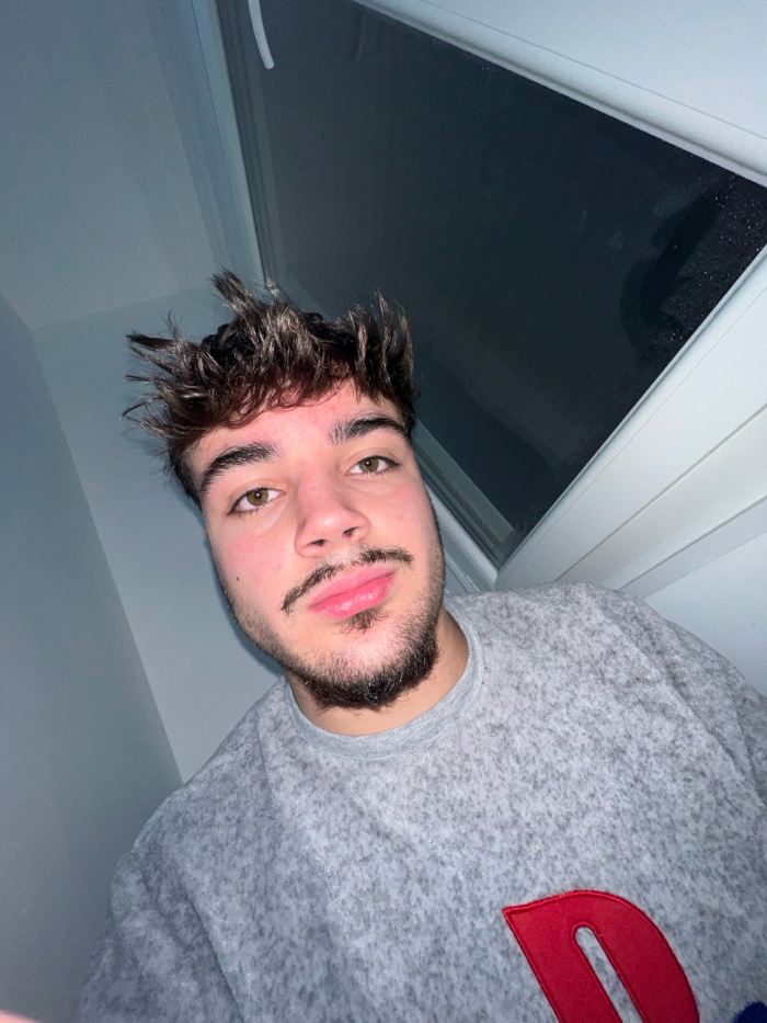 The image is a rotated close-up portrait of a young man, presented rotated 90 degrees counter-clockwise. The man is looking directly at the camera with a neutral expression. He has dark, wavy, and so…read more