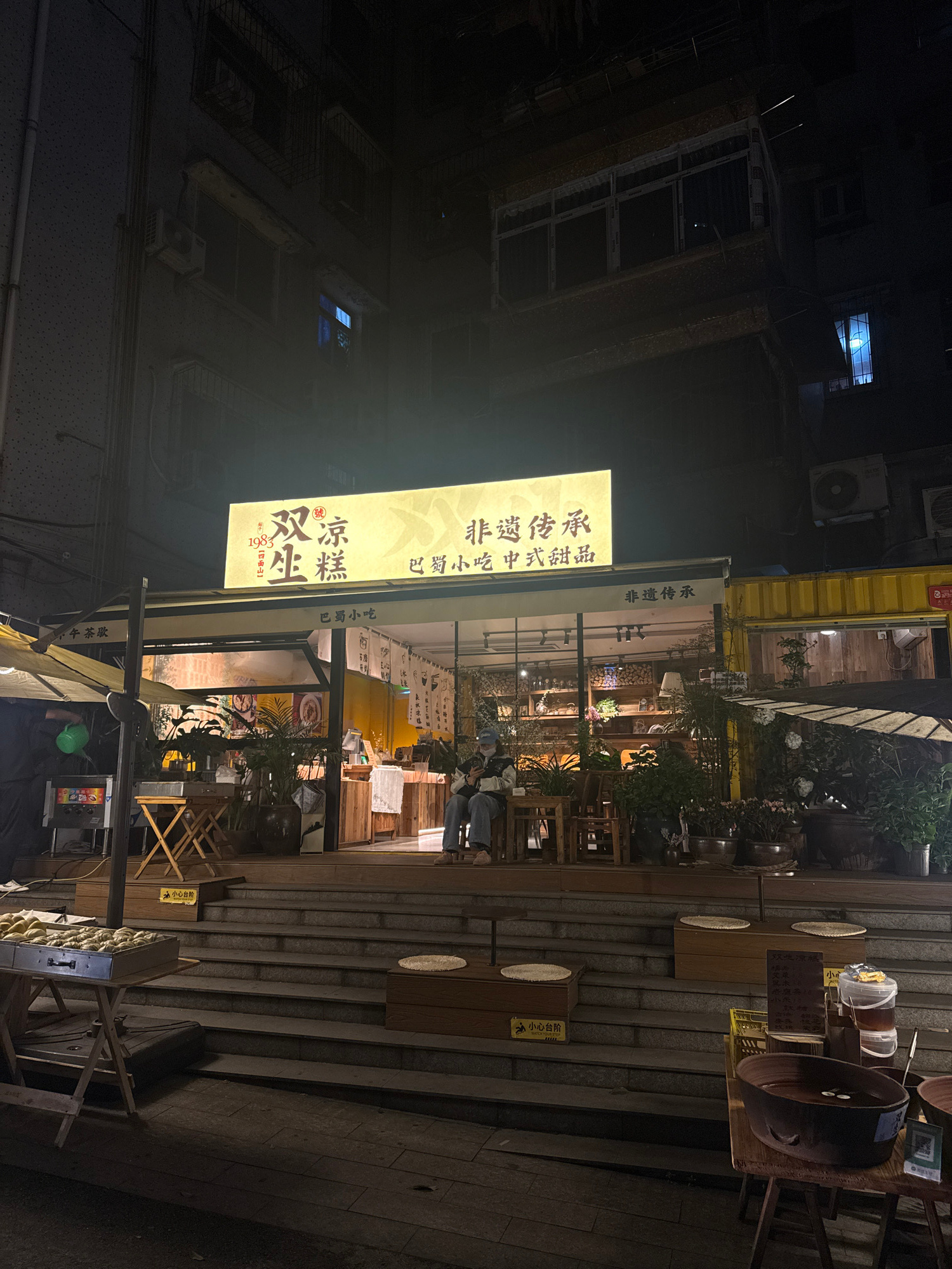 The photograph, taken at night, shows a restaurant or food establishment in the Yuzhong District of China. The sign above the restaurant reads "非遗传承 (Fēiyí Chuánchéng)" which translates to "Intangible…read more