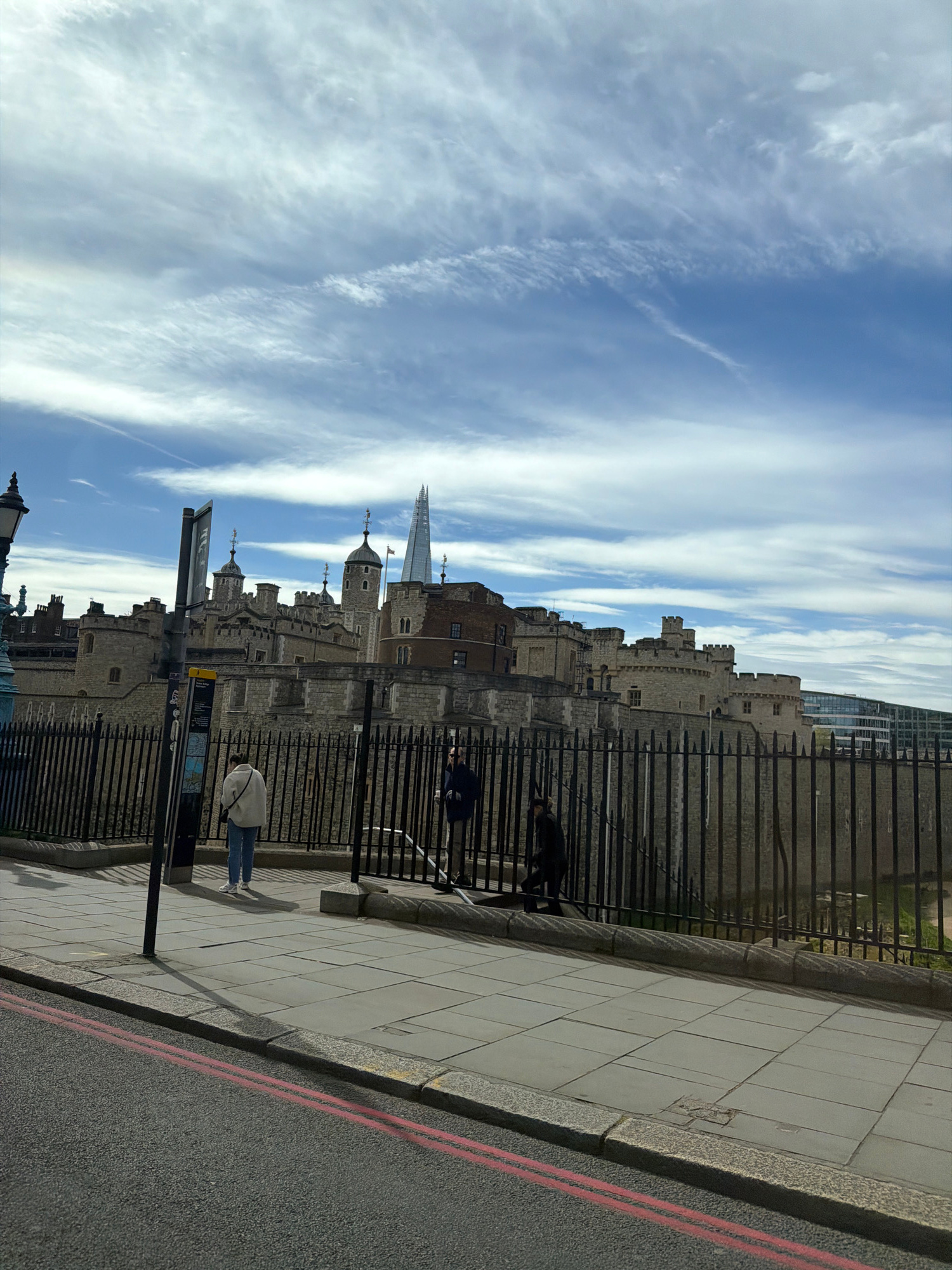 The image shows the Tower of London in London, UK, with a clear blue sky and scattered clouds in the background. The architectural details of the Tower are visible, including its stone walls, turrets,…read more