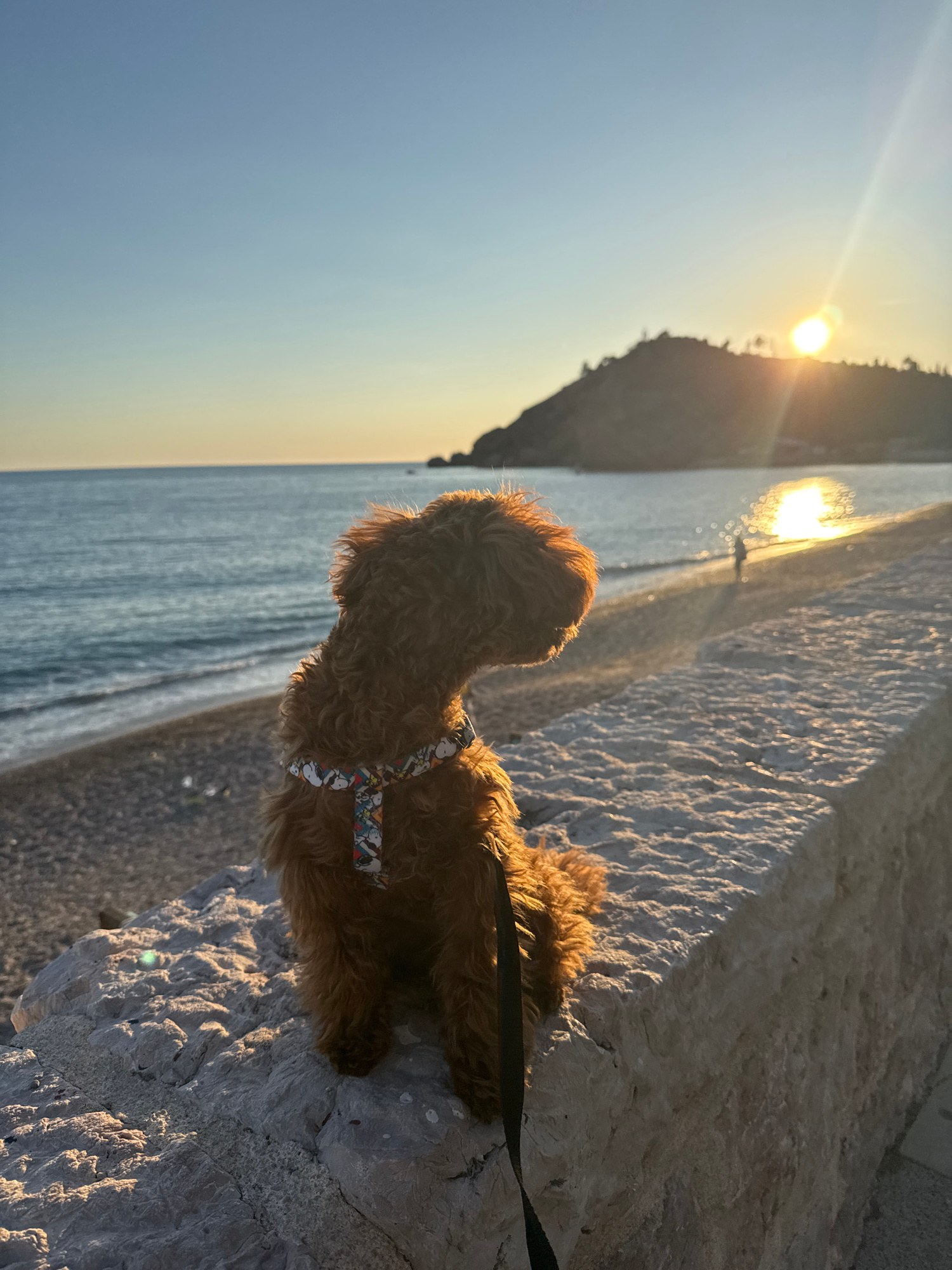 A medium shot captures a small, brown poodle standing on a stone wall, overlooking the sea at sunset. The dog is facing away from the viewer, its collar patterned with Snoopy characters. A black leash…read more