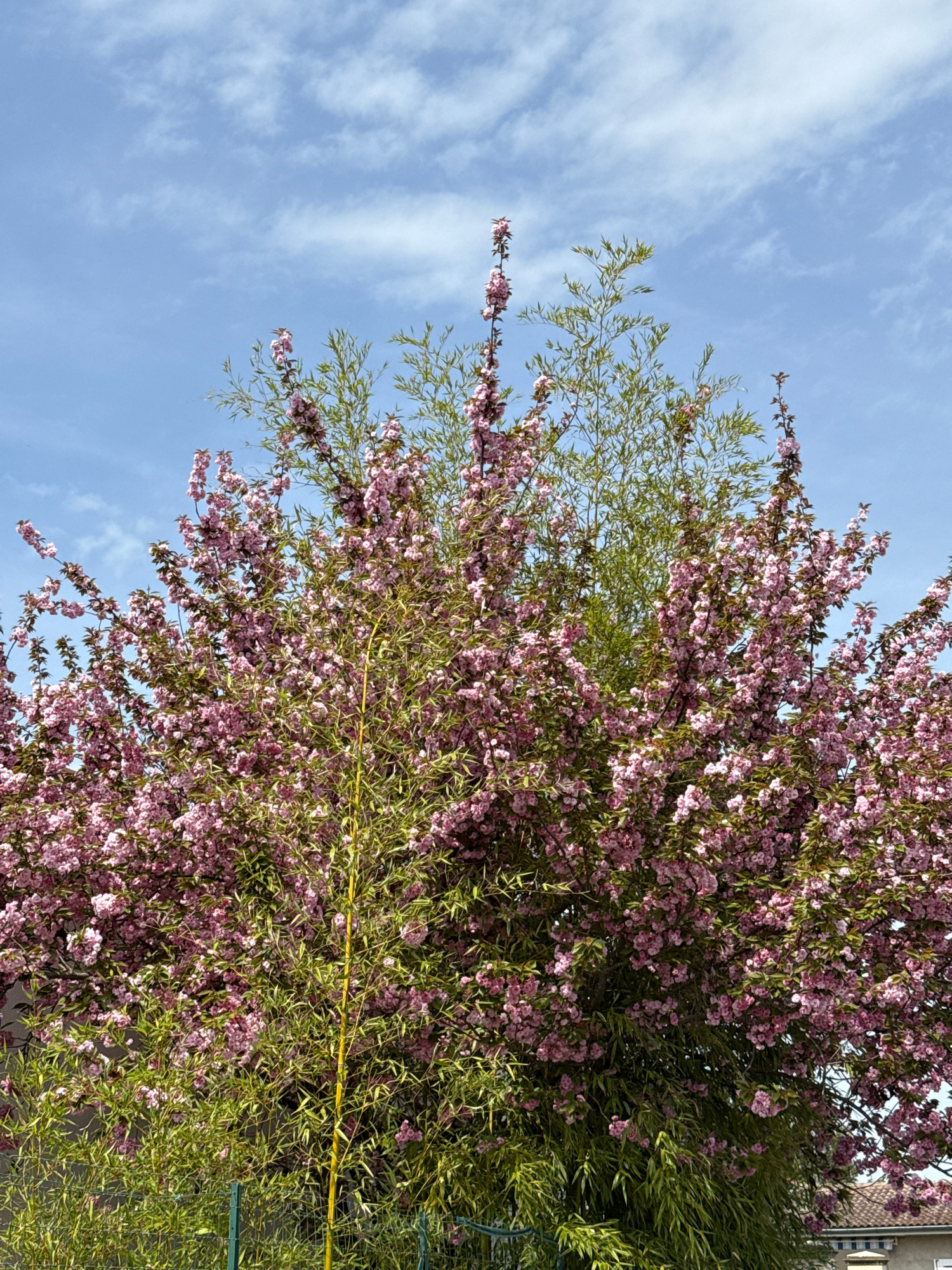 The image depicts a tree with pink blossoms and green leaves against a blue sky with wispy clouds. There is a yellow object running through the branches. The location is Veauchette, France.